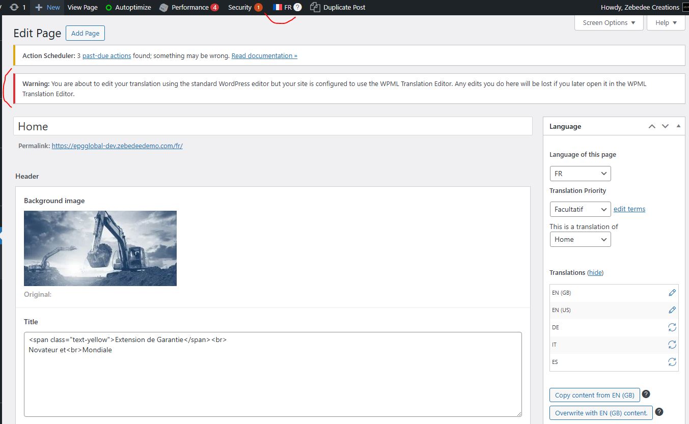 Also, when trying to edit the page we received the attached warning, does it mean we cannot use the flag at the top to change the language to be edited?