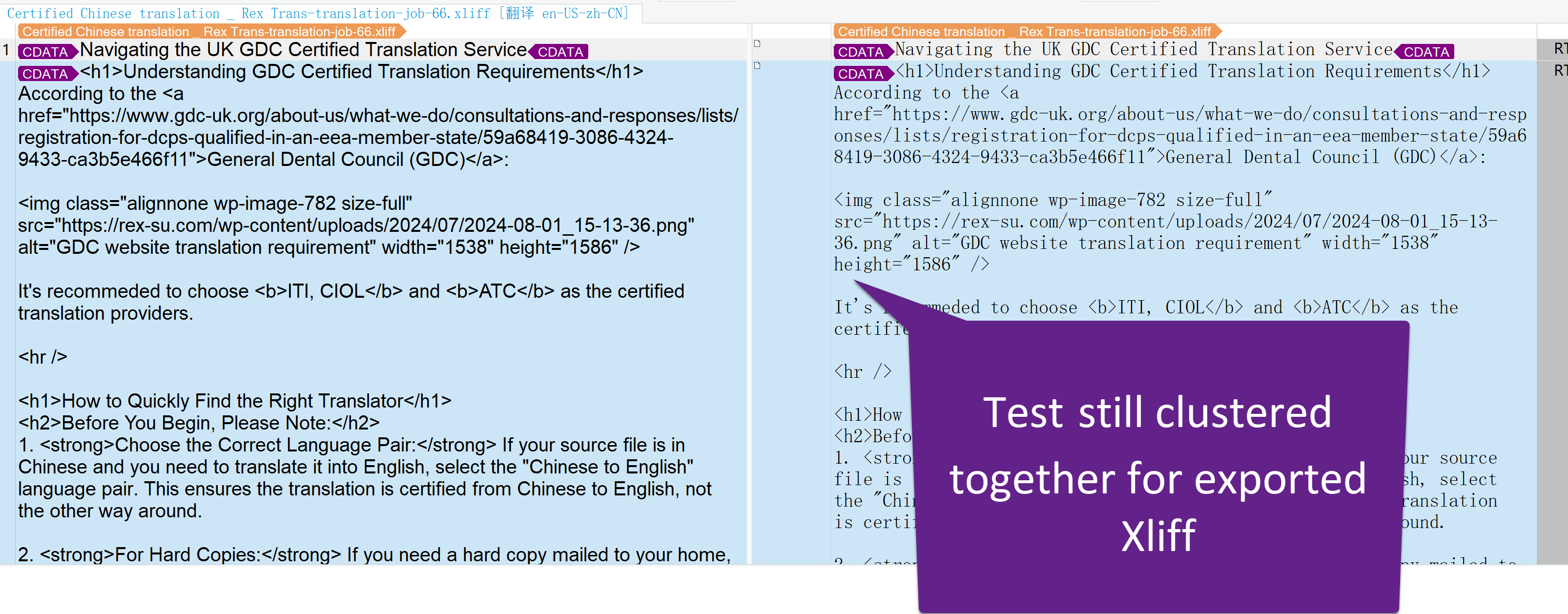 Problem: If you're experiencing issues with exporting translations to XLIFF where strings appear clustered together or included by codes or tags, especially when using tools like Phrase and Trados, this might be due to the timing of job creation and page edits. Particularly, this issue arises when using Elementor for page building. Solution: We recommend the following steps to resolve this issue: 1. Avoid editing pages while translation jobs are in progress. If you must make changes, resend the job for translation to ensure the XLIFF file is generated correctly. 2. Resend the translation jobs for your pages after ensuring no recent edits interfere with the translation process. 3. Consider using the Advanced Translation Editor (ATE) which can parse the XLIFF file and divide them into smaller segments. 4. Alternatively, use an advanced XLIFF editor software that can help in separating each unit into smaller segments. 5. If using Elementor, try to use one paragraph per widget to help break down the page into more manageable units for translation.