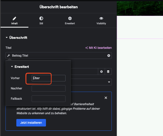 In Elementor im using dynamic "Post Title" field for displaying my post title in my templates. In the dynamic post title field i set an prefix "Über " - this prefix is not shown in ATE or in string translations, so currently i have no change to translate it in english which should be "About ". How to translate that? Check the screenshot vor better understanding what exactly i mean.