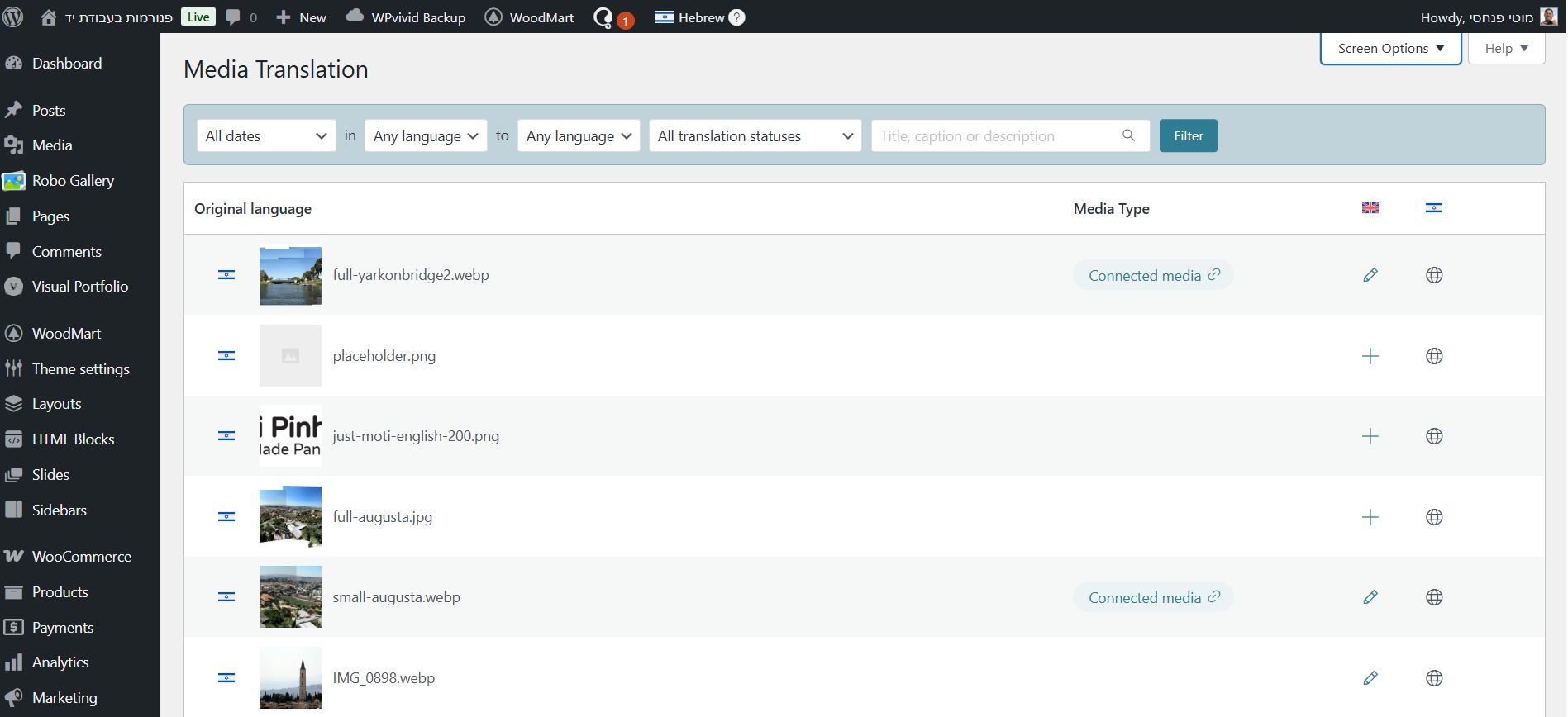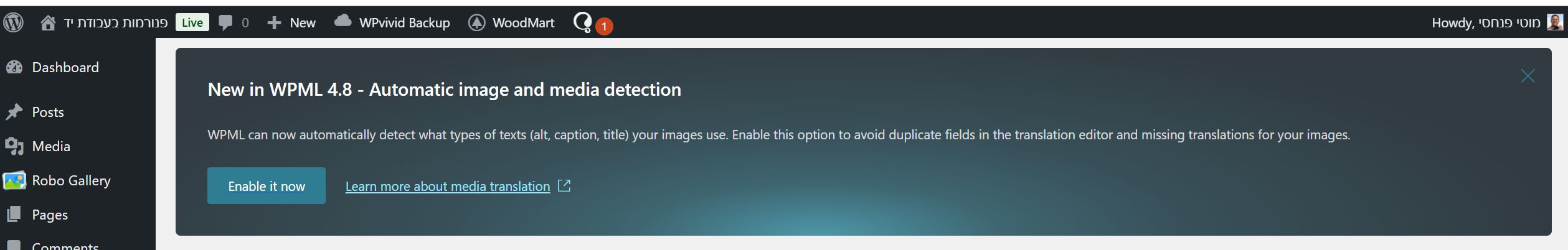 Problem: The client is using the Robo Gallery plugin and has issues with media titles not translating to the selected language, despite running a full site translation and translating individual media items. Solution: 1. Go to WPML->Settings->Media Translations. 2. Disable 'Automatically detect best options for translating image texts (alt, caption, title)'. 3. Click on 'Setup Manually'. 4. Enable 'Translate Media Library texts (alt, caption, title) when translating content'. 5. Create a dummy post, add a gallery including all images from a gallery that's not translated. 6. Publish the post and auto-translate this post; the media files should translate as well. 7. Check on the front-end if the gallery shows the translations. If this solution does not resolve your issue or seems outdated, we recommend checking related known issues at https://wpml.org/known-issues/, verifying the version of the permanent fix, and confirming that you have installed the latest versions of themes and plugins. If the problem persists, please open a new support ticket.