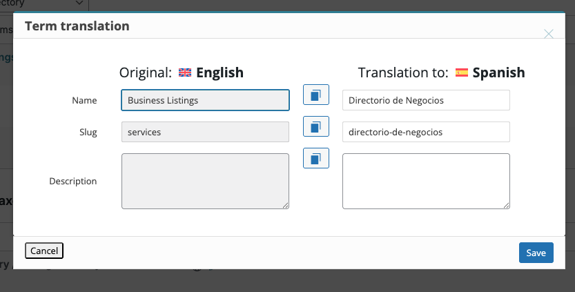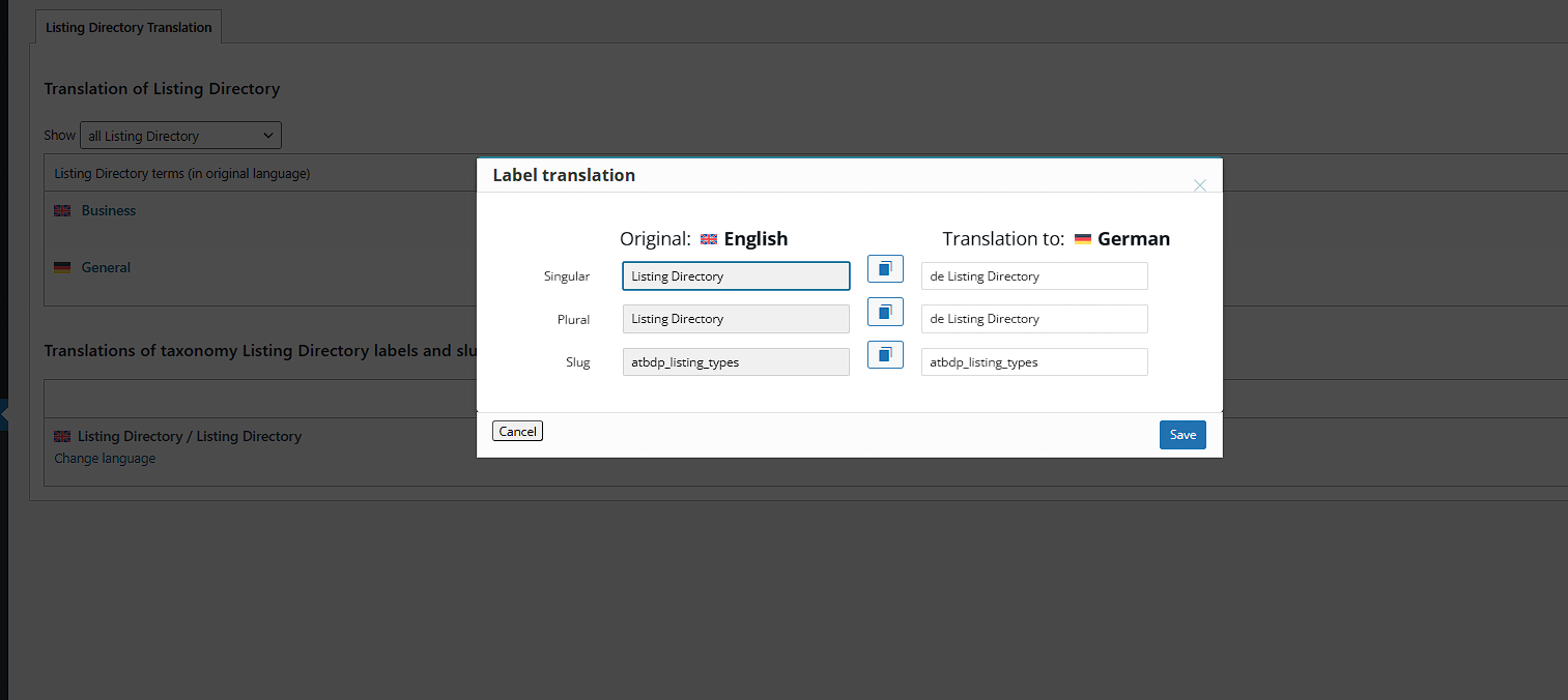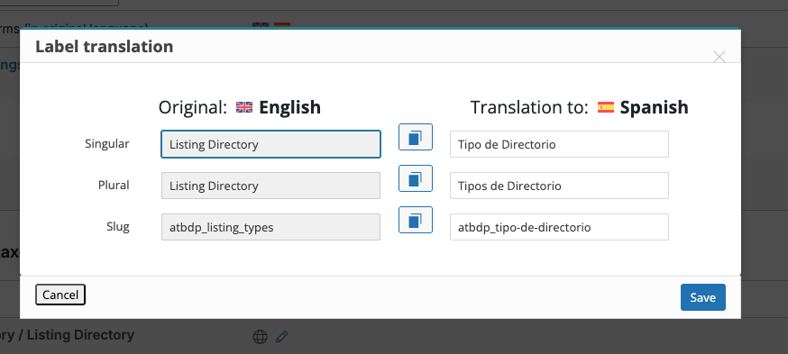 I have not tested to translate the base slug and would suggest using in this case the same slug atbdp_listing_types in both languages. Indeed, you would need to create some translations to confirm if the issue is solved. For now, make sure that my suggested custom XML config is saved inside WPML > Settings > Custom XML Configuration. Also, revise WPML > Settings > Custom Field Translation for proper settings. Check also after clicking "Show system fields". You can use my sandbox as a reference for the correct settings: |