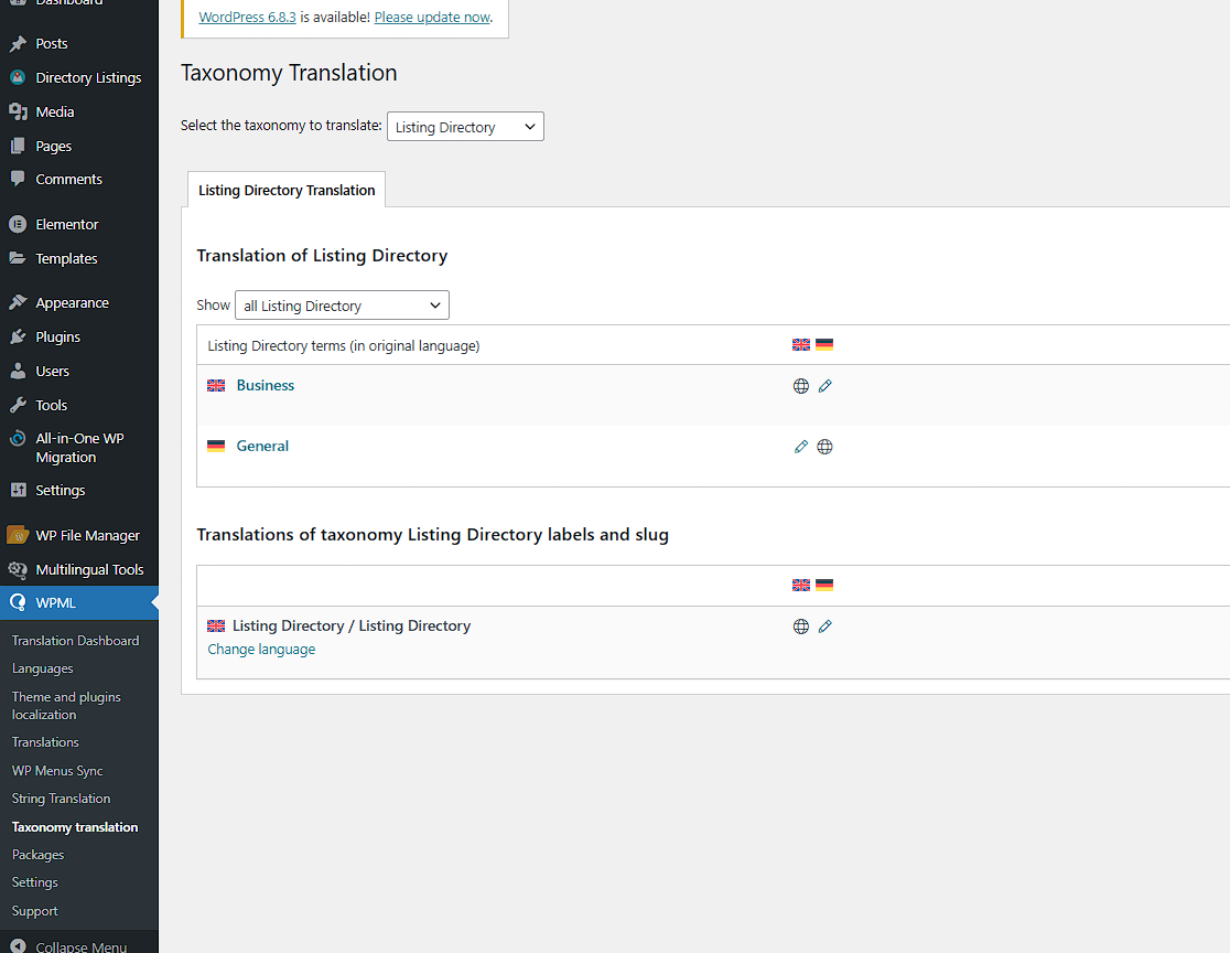 The directory type issue can be solved by going to WPML > Taxonomy Translation and making sure that "Listing Directory" is translated. Important is also important to translate the base slug atbdp_listing_types. See screenshot. Please give this a test on your site. |