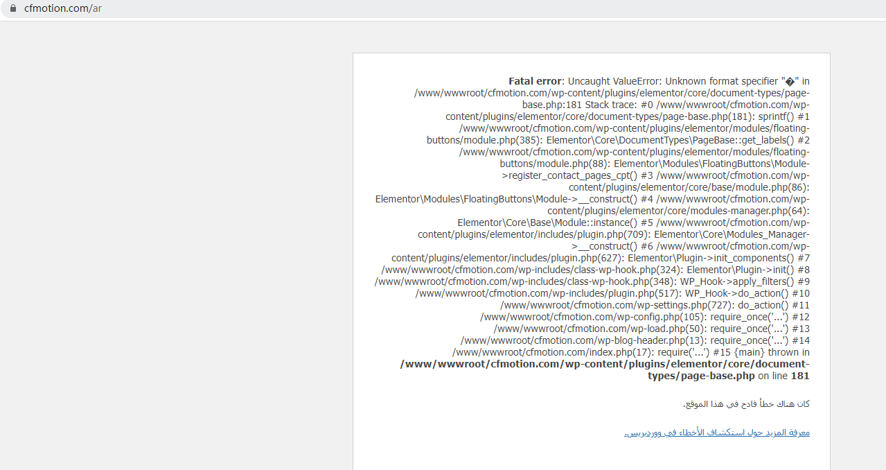 Accessing the Arabic version of the site results in an error. URL: hidden link