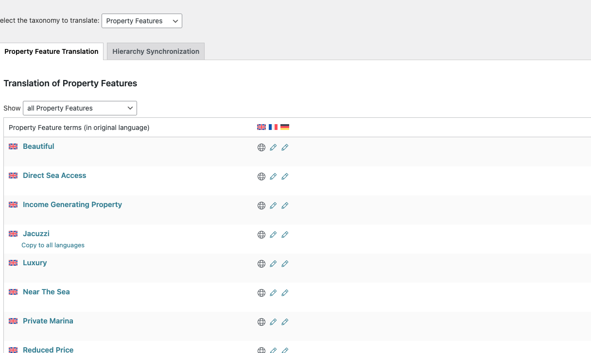 For example, if you view a German property, then the features neither show up translated, which is expected in your current setup: