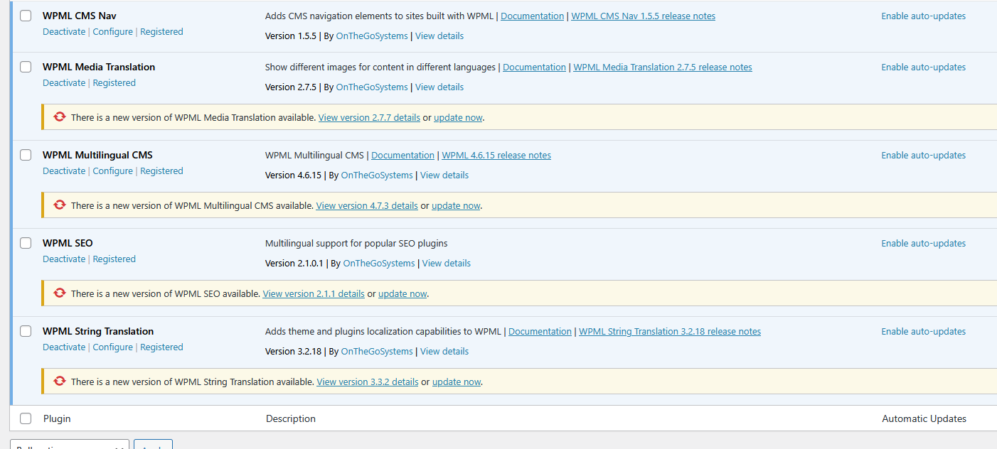 So, I went back now. And the backup before I updated all WPML The status you can see on the screenshot thinks worked just fine. I also remember, that I have had problems with the update, because I could not activate OTGS Installer, which I still can not do. |