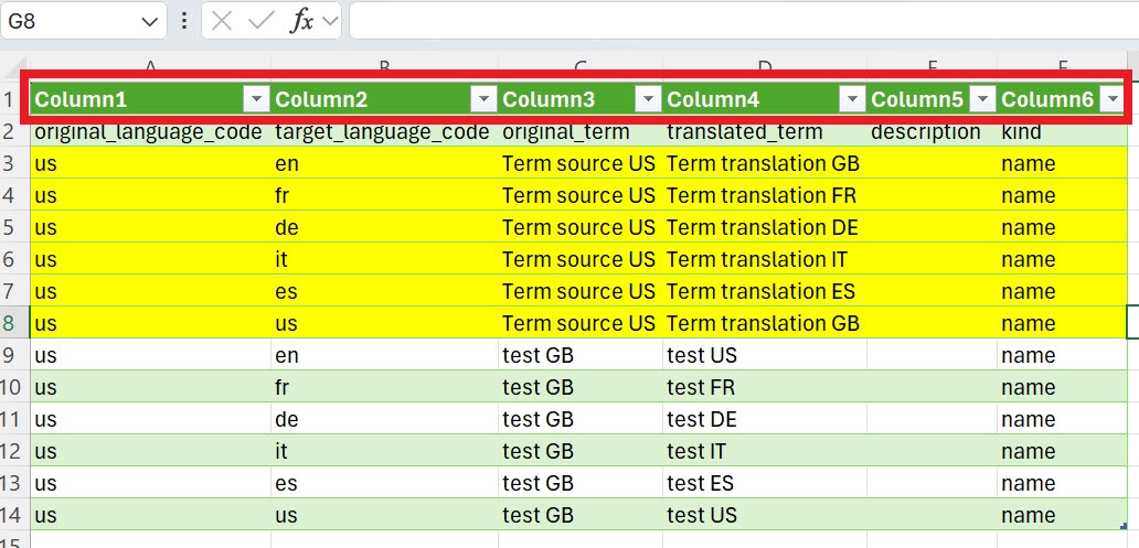 2. Verify that each row contains the term in the default language and that other language columns are filled or left empty if no translation is available.