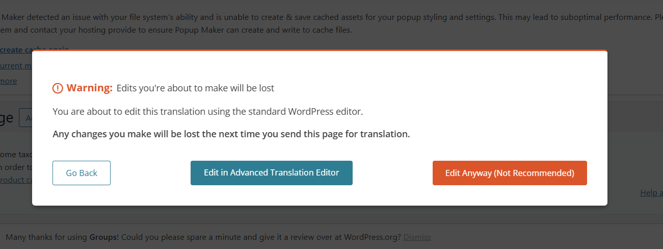 You are receiving a popup when editing the French side of your website, which you had not encountered before. This popup appears when you choose to edit in the Advanced Translation Editor but opt to edit anyway in the WordPress editor, despite recommendations against it.