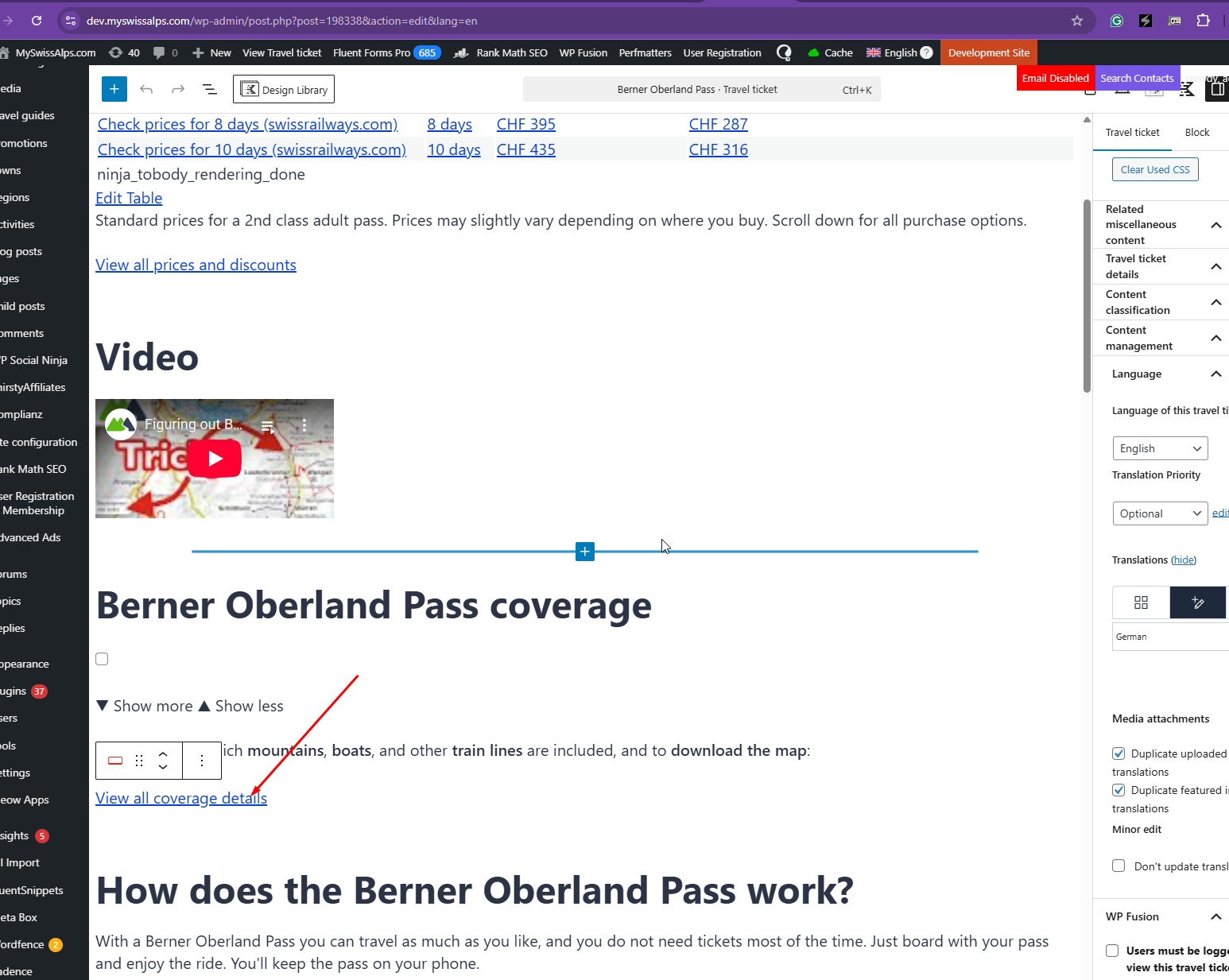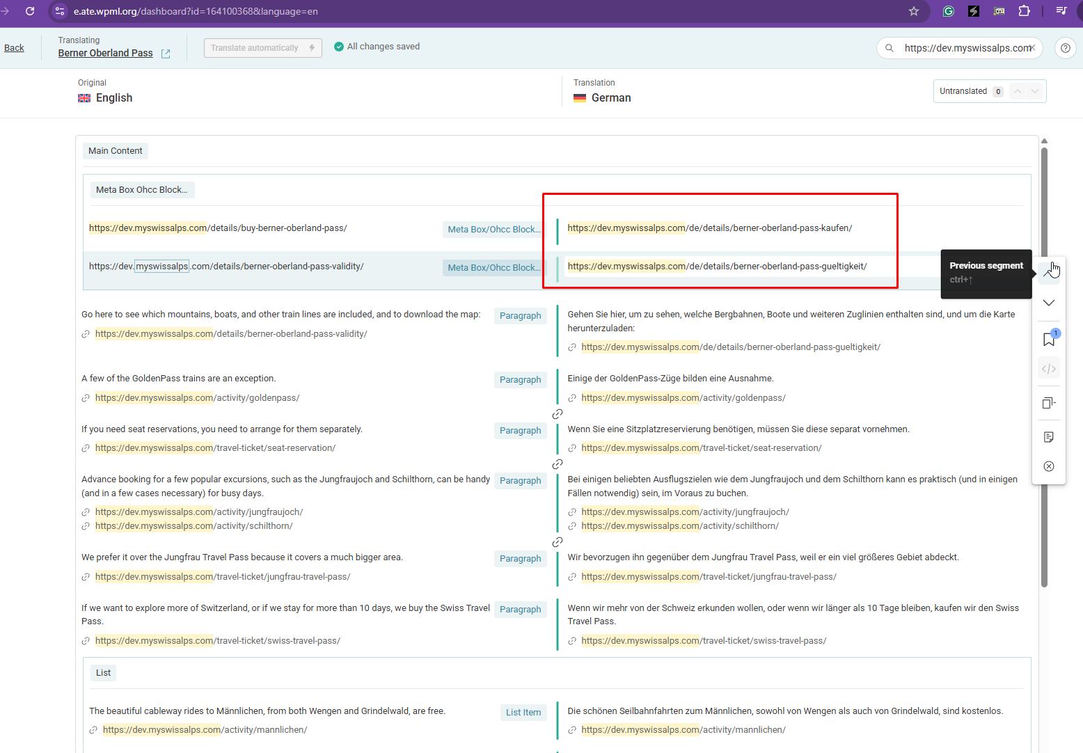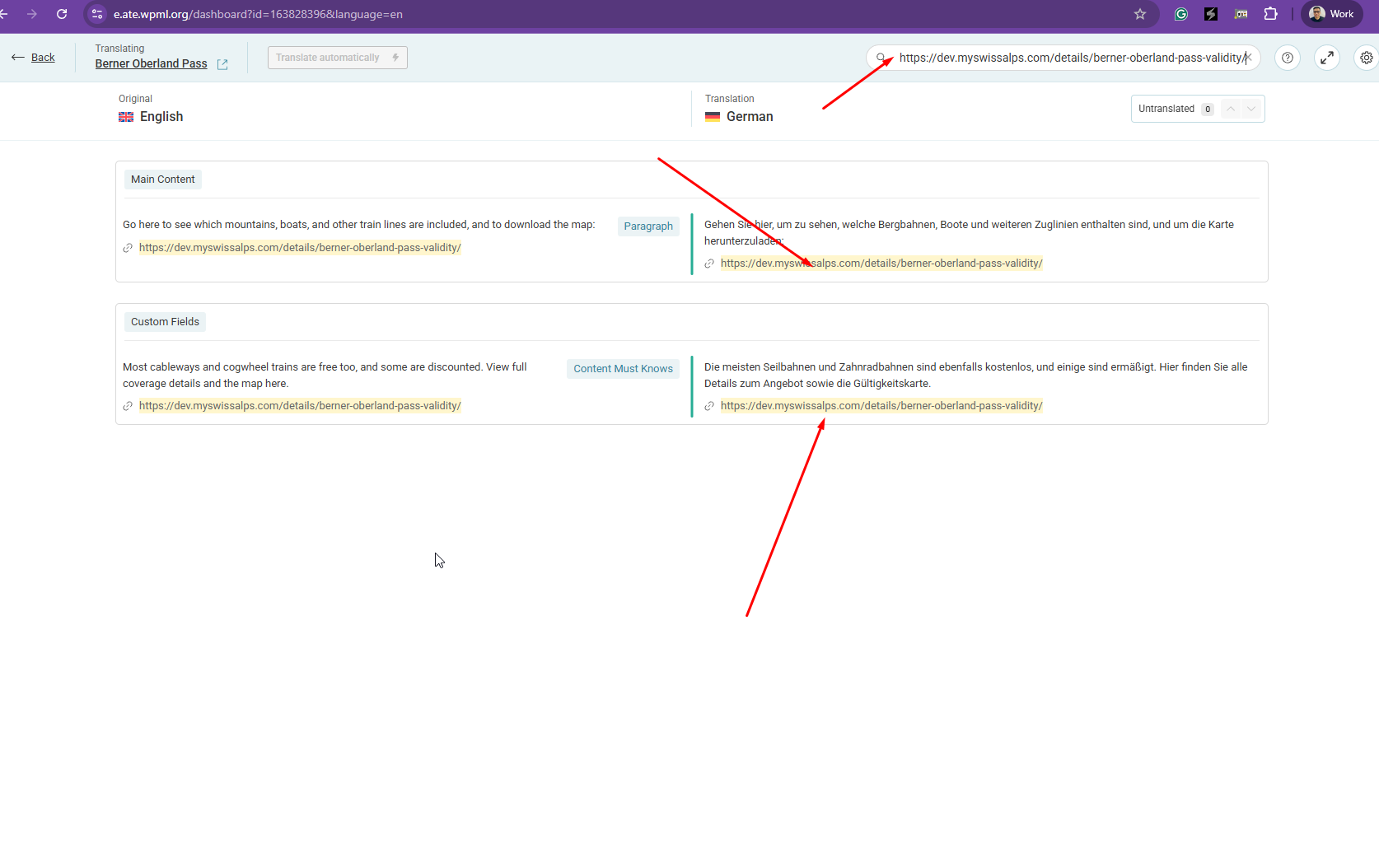 Hi Kor. Two observations: 1) On the page hidden link, the links in bullet point 2 and 3 under "Zusammenfassung", are now correct, and we did not do anything. This does not apply to all pages, but that might be caused by caching. It's an improvement because of the fix I guess. But buttons like "Alle Preise und Rabatte ansehen" still link to English. 2) I wanted to try what happens if I retranslate, but I can't translate many of the posts. The WordPress backend screen simply refreshes, and I never get to see the WPML ATE. Please try and go to hidden link and edit post 223701, for example. There's no error in the browser console. I've never seen this before, so it must be caused by the fix. Can you fix point 2? Only then can I really test what happens. |