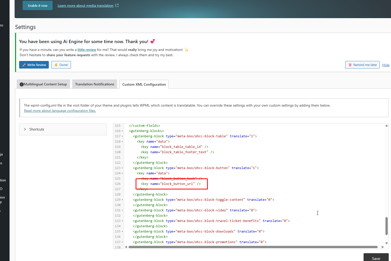 Thanks for your reply. I've added the custom XML configuration below and the links should be translatable now as shown in the attached screenshot. <gutenberg-block type="meta-box/ohcc-block-button" translate="1">