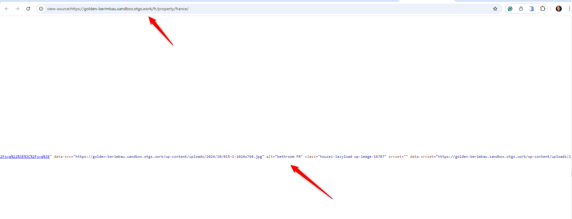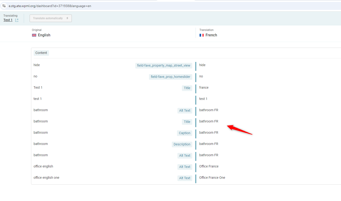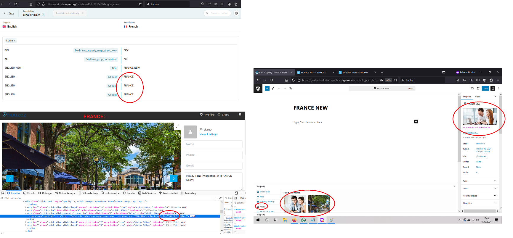 Unable to translate the alt text for 'property images' from English to German using the Media Translation feature in WPML. Despite changing the alt text in the Media Translation and Real Estate sections, the frontend displays the English alt text instead of the German alt text, and the backend reverts to the English alt text after saving.