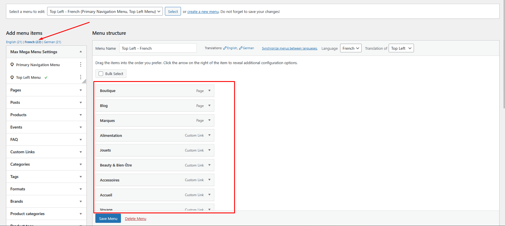 You have added the menu using the Max Mega Menu: hidden link. I'm sorry, but this plugin is not officially compatible with WPML and we've already had quite a few reports about it. For example, please see this ticket: https://wpml.org/forums/topic/setup-translation-of-mega-menu/. I can also see in our internal documentation that our compatibility team has tried to contact the developers of this plugin to cooperate with them on making their plugin compatible, but they didn't respond. The responsibility for the problem is on them. They also published a guide on using their plugin with WPML: hidden link. I can make an effort and check things on your site to see if I can help. But if not, please consider contacting them about it.