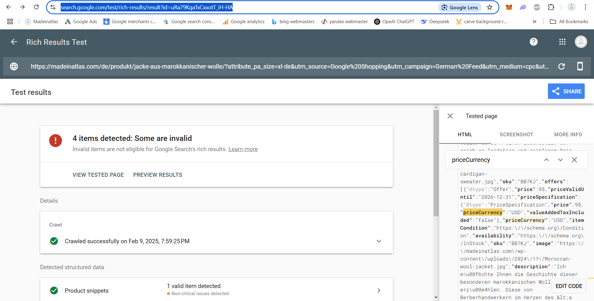 The best would be to hire an SEO agency and see how this impacts your score and if it needs changing, it might not need to since it works fine for user locations. I checked and I do not see a price currency mismatch, but some other errors in your case: