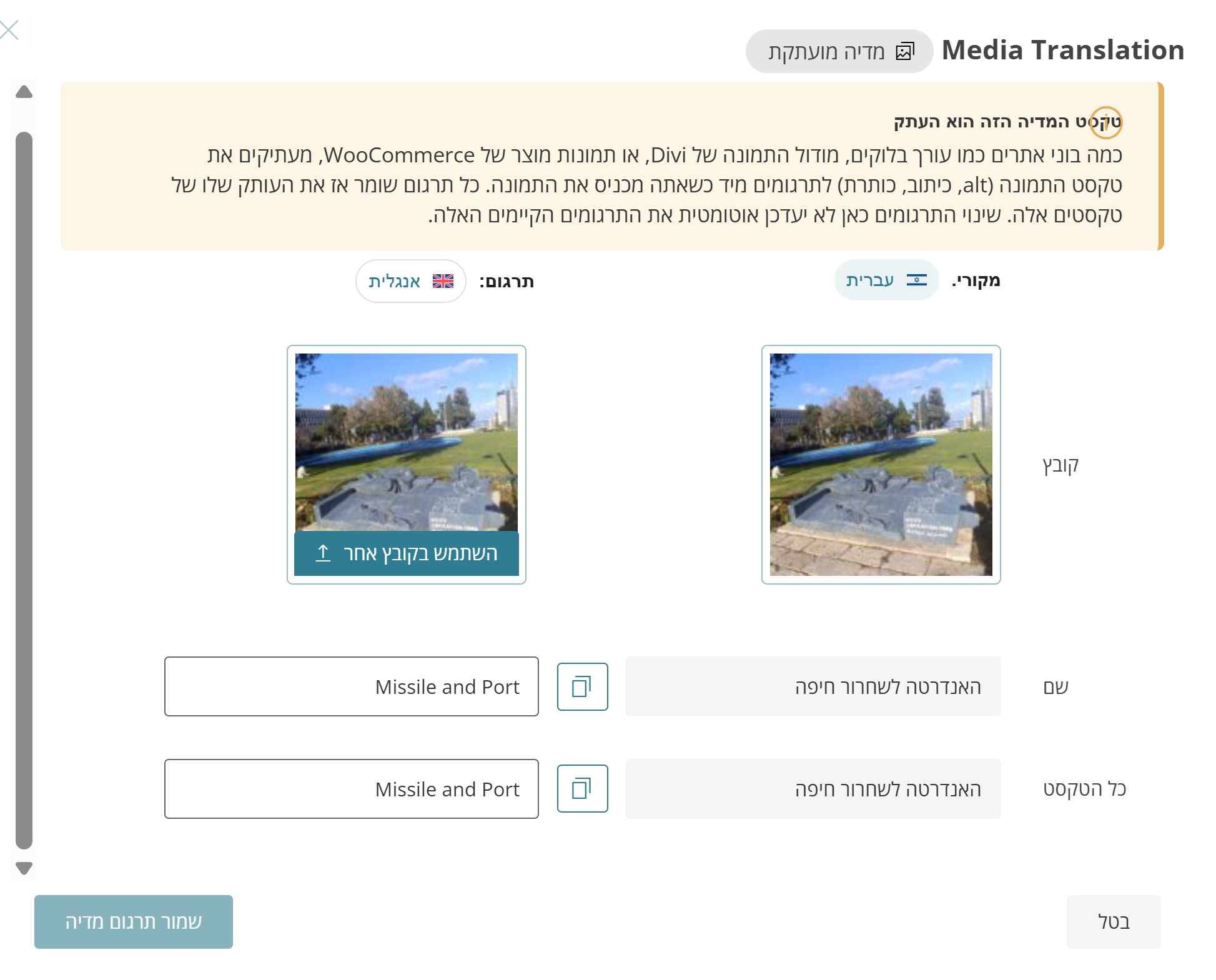 I’ve opened the Advanced Translation Editor and located the media Alt Text you mentioned, “האנדרטה לשחרור חיפה.” In the Advanced Translation Editor, this text is translated as “The monument to the liberation of Haifa” (see the screenshot labeled ATE).