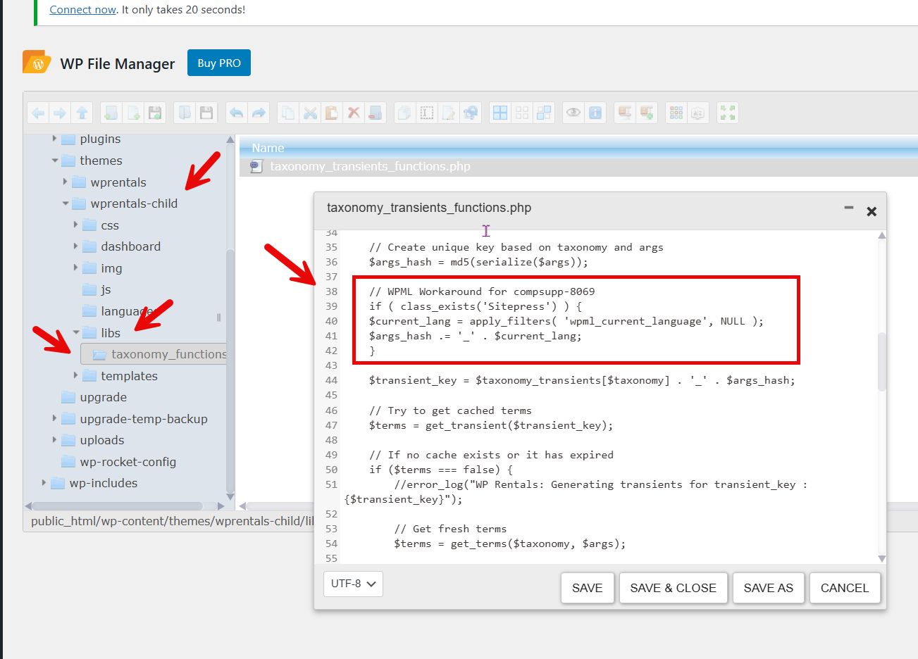 Thank you for your patience and cooperation. I was able to find the reason of the problem. This is due to the WPRentals Cache. Although cache is disabled in WPRentals Options -> General -> Theme Cache but still if I clear the cache using the top admin "Clear WPRentals Cache" on frontend, it regenerates the cache in the language we're currently on. So all those parent level taxonomy labels (from Features & Amenities) are shown in that particular language. The child level taxonomy labels are fine. Please hidden link">watch my screen recording to understand the problem. The next step is that I'm going to take the theme from your staging site and 'll try to reproduce the issue in a fresh sandbox site of my own. This way I'll be able to identify (or rule out any possibility of) if the problem is only happening in your server (or DB) or can be reproduced elsewhere. And based on that, I'll check with my team and escalate the matter accordingly. Please allow me some more time. I'll keep you posted on this. |