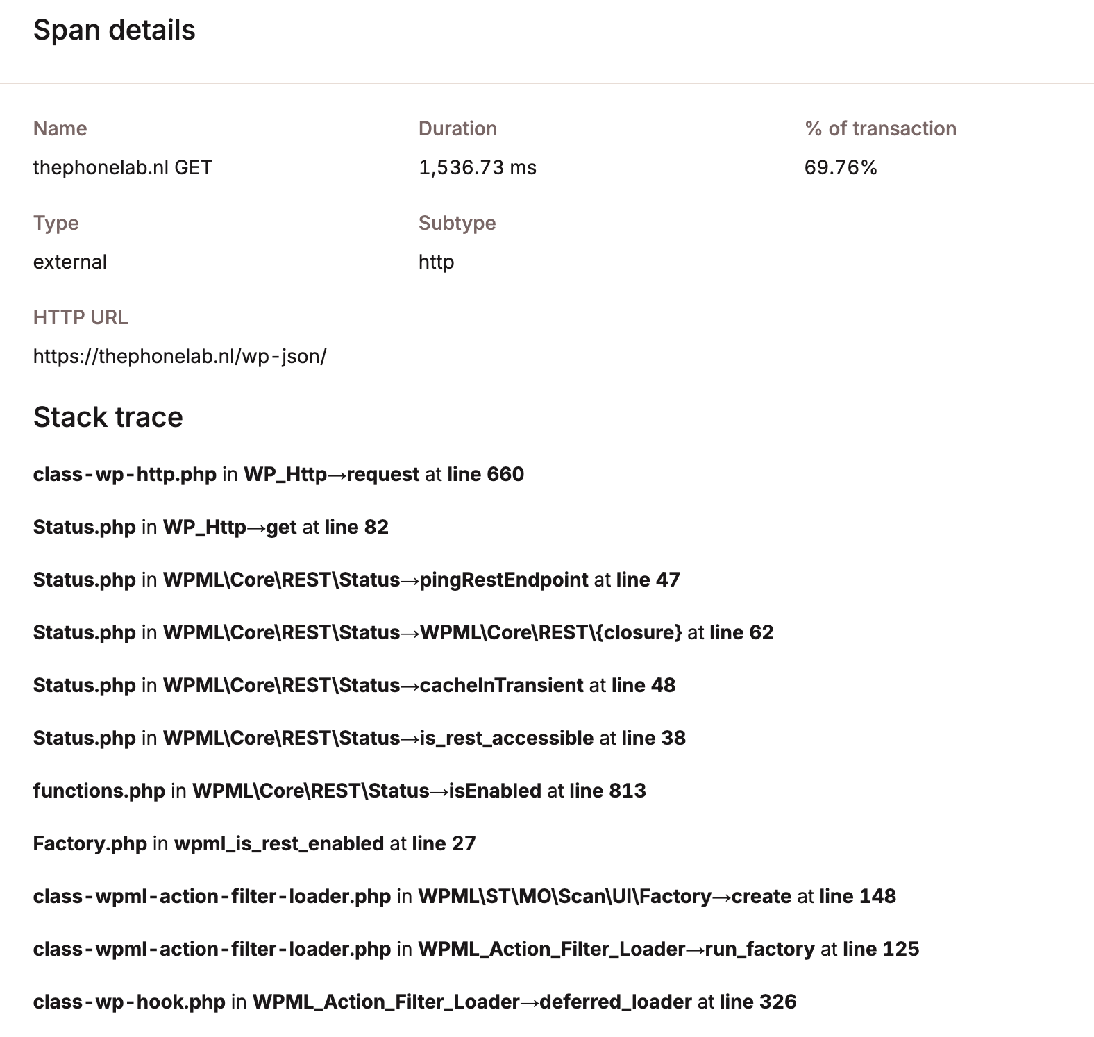 Based on your screenshot, there should be an unexpectedly high load time when calling: Calling this URL on your site takes about 3 seconds and on second load, 2.5 seconds. If I disable WPML, it takes 2 - 2.5 seconds. An impact of 0.5-1.0 seconds in load time can be considered normal when using WPML, due to its complexity. Note: Source: I installed the Query Monitor Plugin on your site, but I can not identify any load times that are far beyond the expected values. Example "Homepage": With WPML, it takes 3.6 seconds to load the Homepage. If I try testing the homepage without WPML, I get an error: Uncaught Error: Undefined constant "ICL_LANGUAGE_CODE" in /www/thephonelab_868/public/wp-content/themes/thephonelab/includes/actions.php on line 312 Call stack: lf_redirect_when_cart_is_empty('') wp-includes/class-wp-hook.php:324 WP_Hook::apply_filters(NULL, array) wp-includes/class-wp-hook.php:348 WP_Hook::do_action(array) wp-includes/plugin.php:517 do_action('template_redirect') wp-includes/template-loader.php:13 require_once('/www/thephonelab_868.../template-loader.php') wp-blog-header.php:19 require('/www/thephonelab_868/public/wp-blog-header.php') index.php:17 This happens if you use WPML-related code without checking if WPML is currently active on the site. If you use code like that, I suggest you wrap it into something like: if (class_exists('sitepress')){ // your code } Also, please verify if the issue on the site might be theme-related, as this theme is using custom code. I then switched to the Twenty Twenty One Theme for testing, and the Homepage still needs 2.5 seconds to load entirely, even without running WPML. Enabling WPML at this point leads to a load time of 3.4 seconds on first load, 3.0 seconds on second load, and 2.5 seconds on third load. This means there is an impact of up to 1 second when running WPML, but this is only the case when loading the page for the first time, as after that, the caching will begin to operate. If this is the issue that you would like to report, then I can sadly not consider this a performance issue, as the impact is currently expected when running WPML. If it is a different issue that you would like to report, please name me another URL as an example of an unexpectedly high load time caused by WPML. |