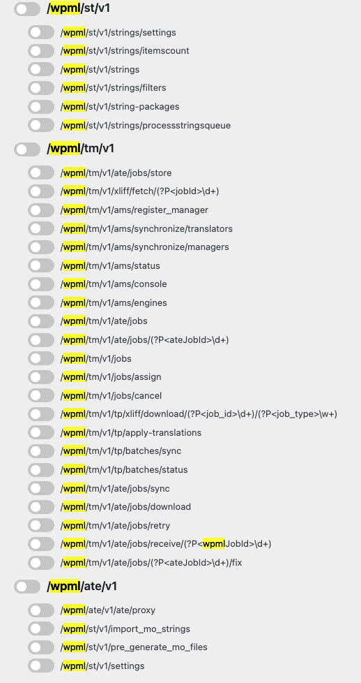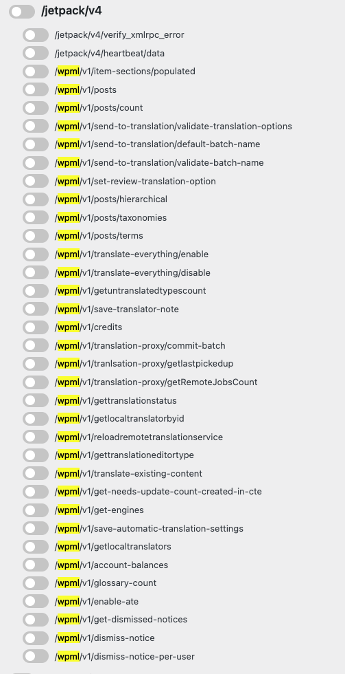 Hi there, Thank you for the analysis. I see in the “Disable rest API” plug-in settings that it's only enabled for not authenticated people. But you have the option to enable certain functionalities. Maybe this will help it. In the screenshots, I shared all the WPML options that are currently blocked by Disable REST API. So should I turn all of these on or just a few? |