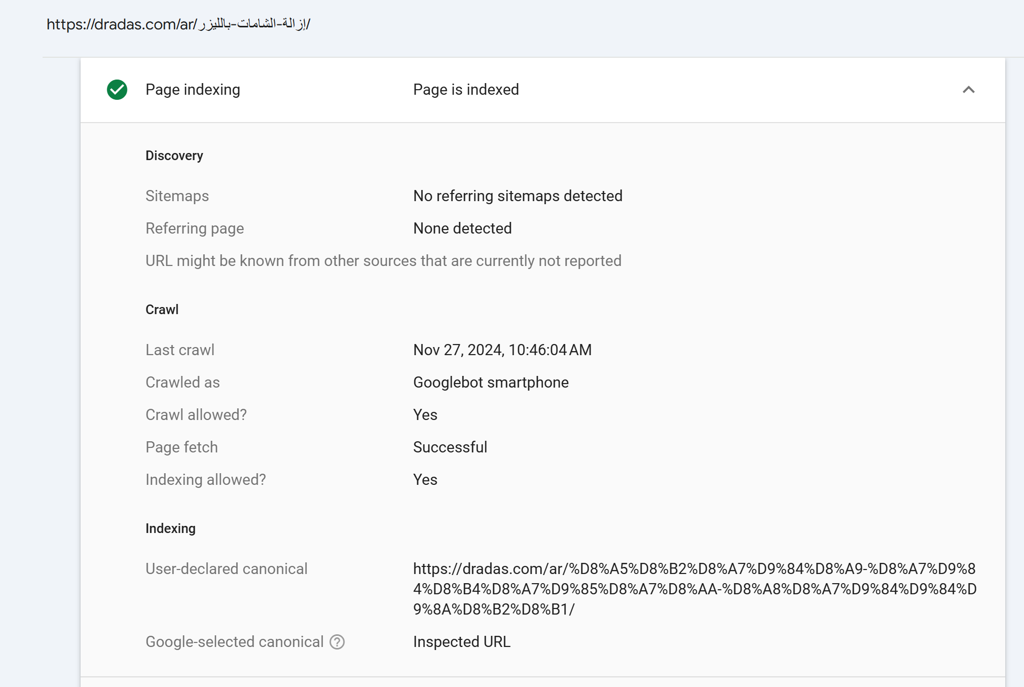 Pages in the English version are detected by Google through the sitemap.xml file, but articles in Arabic show the problem: No referring sitemaps detected.