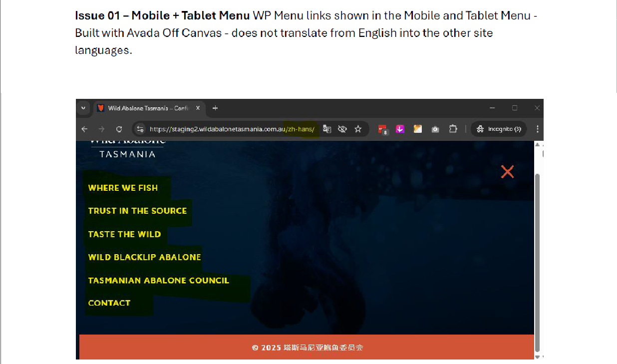 Issue 01 – Mobile + Tablet Menu WP Menu links shown in the Mobile and Tablet Menu - Built with Avada Off Canvas - does not translate from English into the other site languages. (Screengrab attached)