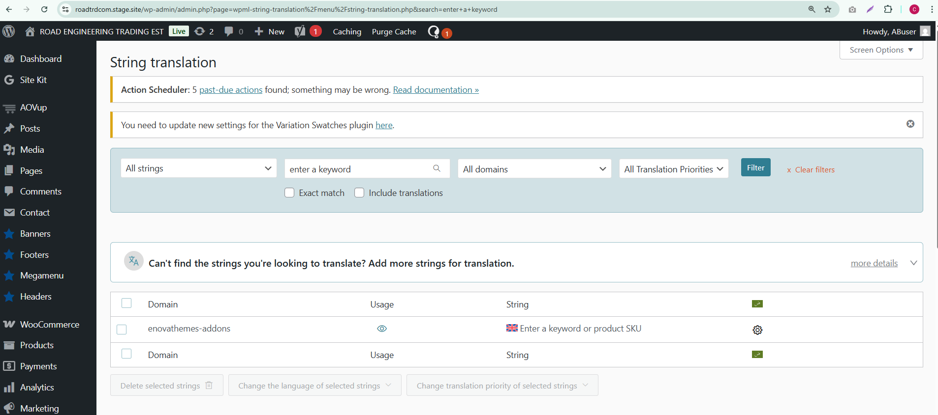 The client reported two main issues: first, some translations remained pending and couldn't be initiated, and second, some pages showed as 100% auto-translated in the backend, but still displayed in English on the Arabic version of the site. Additionally, some string translations displayed a settings icon instead of a pencil icon, preventing editing.