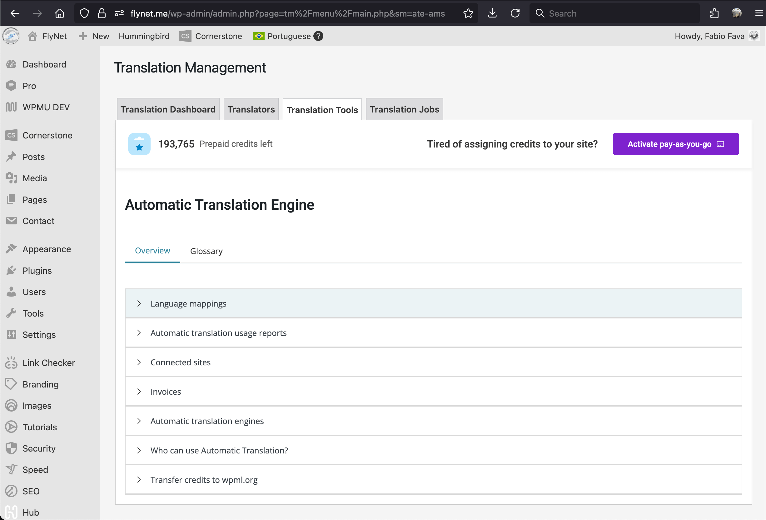 1) Make WPML.org to recognize flynet.me as "Connected/Active" at the "Manage credits for Automatic Translation" screen at WPML.org;