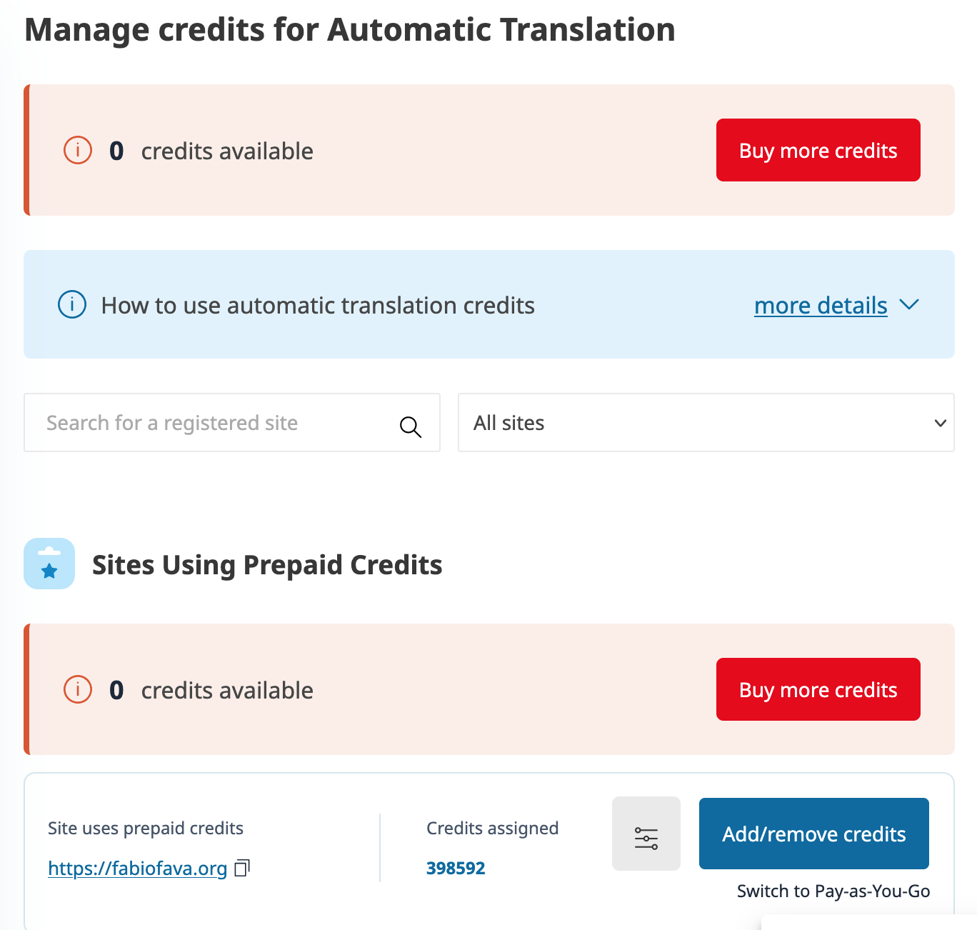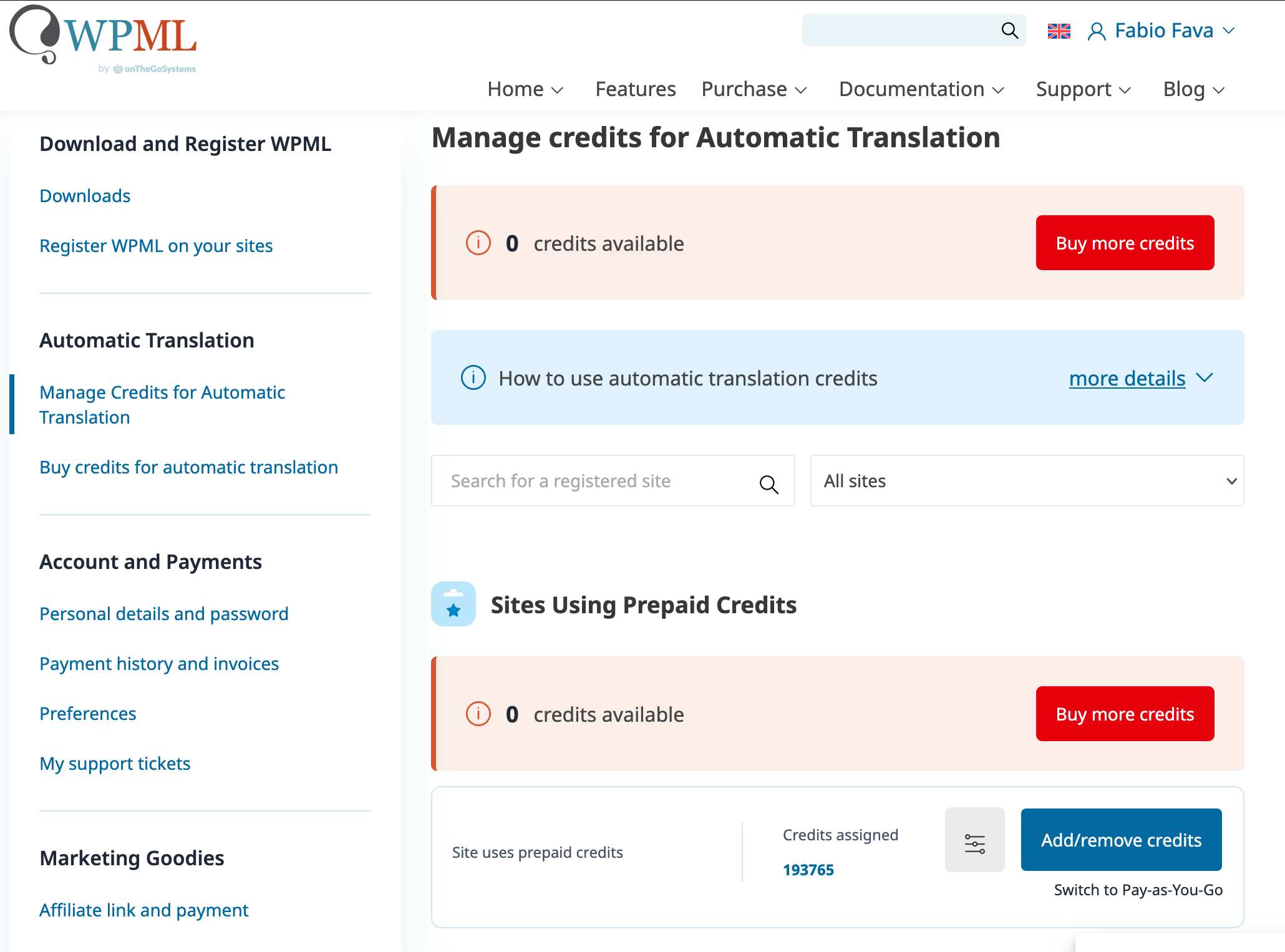 Yesterday i've sent all credits back to WPML.org than deleted all my sites' keys. Today I've started adding just flynet.me to my sites at WPML.org. Didn't add yet fabiofava.org or the Staging version of the FlyNet website (but it detected it's a copy of flynet.me).
