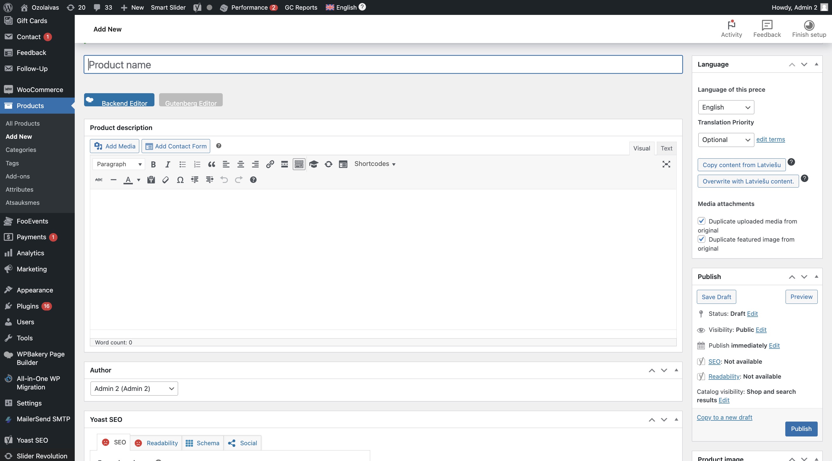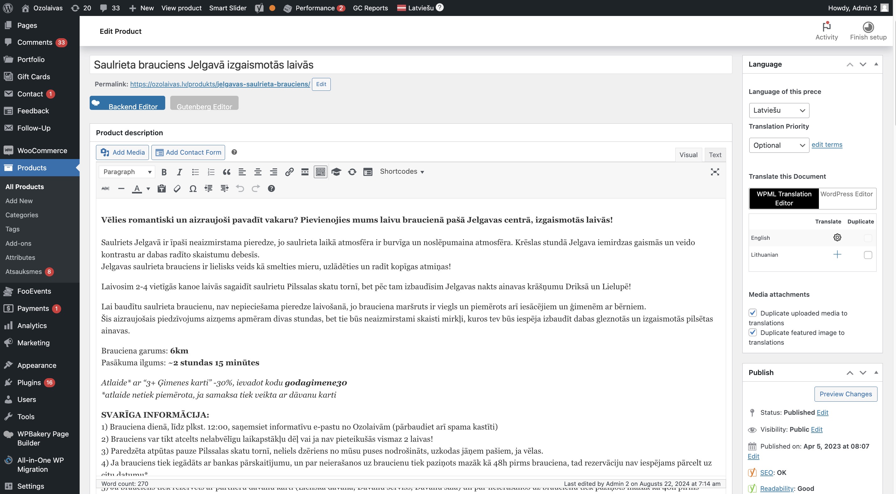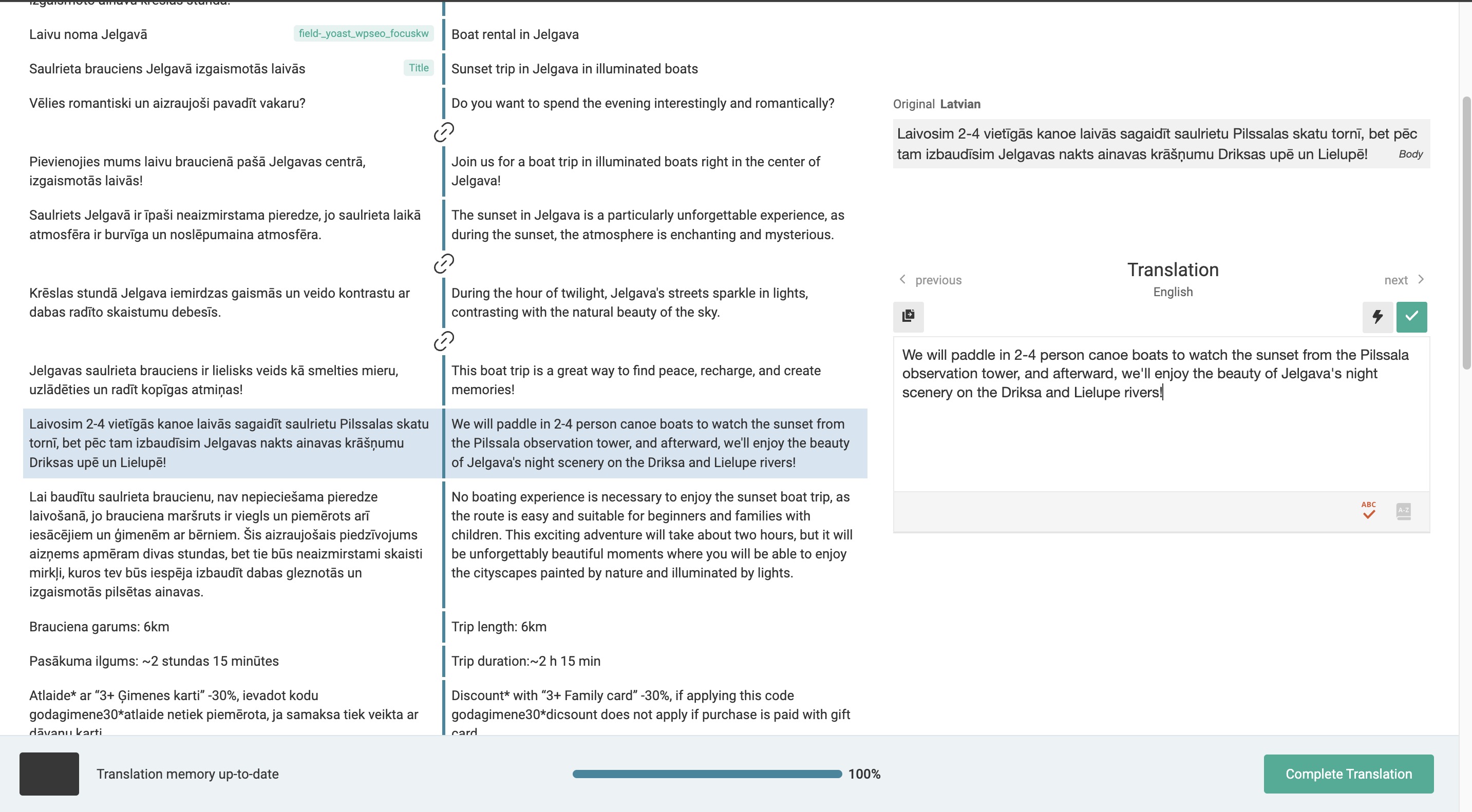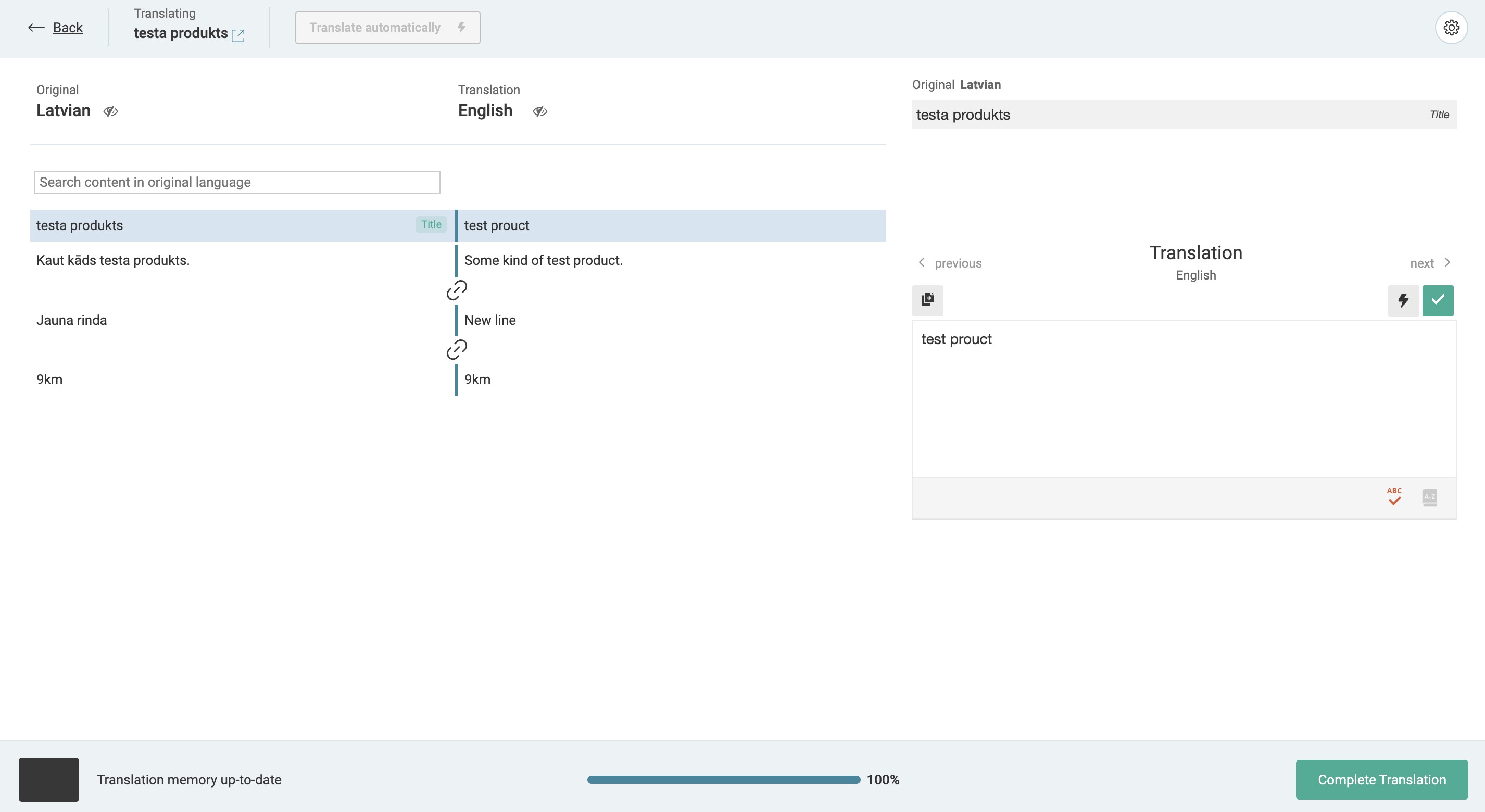 Ok, before I disabled any plugins I tried to create a completely new test product (check screenshot). And it works correctly. If I change something, even one digit, then click on update, then check the translation manager - this change is reflected there and translation works correctly. Product is translated to english successfully. Then I disabled all plugins except the ones that you mentioned to keep active. First I didn't see any change - problem was the same as before (at least when I checked that problematic product I mentioned before). Then I made another change and for some reason changes were reflected in the product translation manager. I translated everything and the translation was applied and now there is an english translation for that product. After that I tried to make a few other small changes in the latvian text, but again - changes were not shown in the translation editor even with all of the non related plugins disabled. I re-enabled all plugins and the problem is still there. I changed text in the translation editor (in the problematic product) , but the change is still not shown there, therefore, english translation is not being updated to the newest cahnges. I also noticed one warning when I went to the product's english version (see screenshot). I don't really know what that means, because translation appears 100% complete (however without the newest changes) and I also don't see anything special in this Translation Management dashboard. |