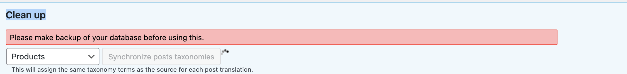 - Select "Product" from the dropdown under "Cleanup" and click on "Synchronize Post Taxonomies"