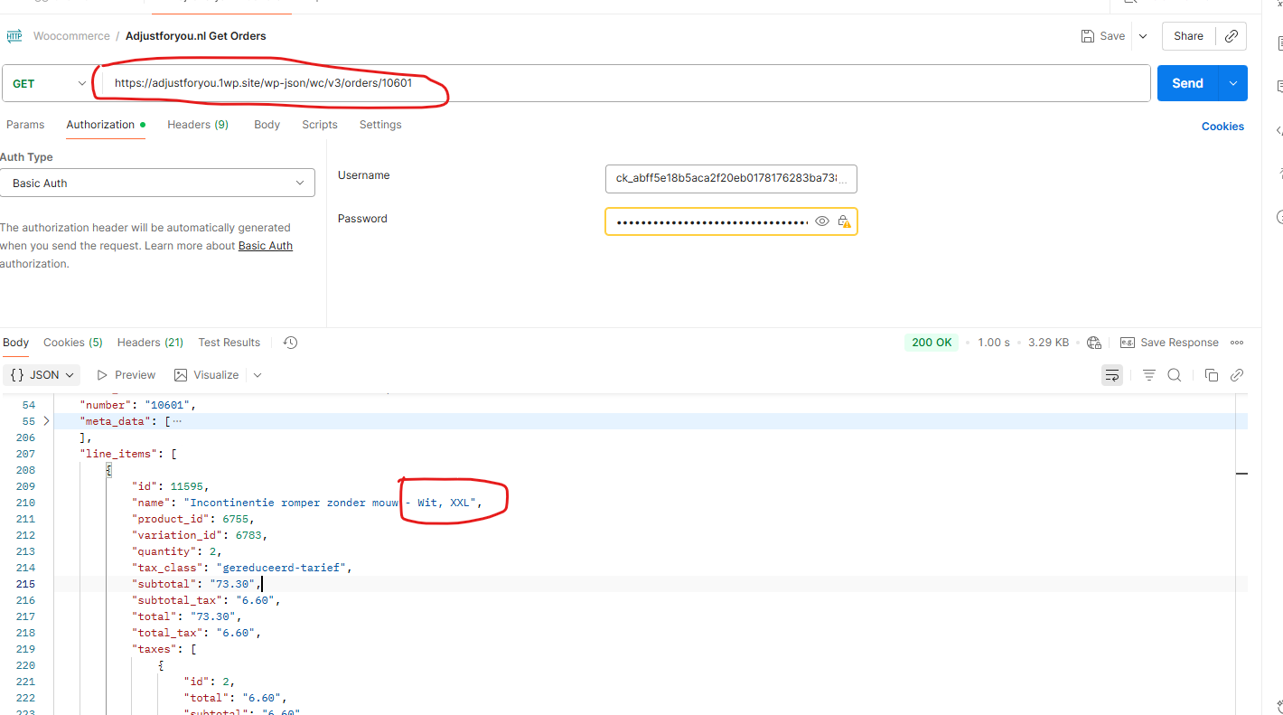 I am trying to fetch all orders using our invoicing system via REST API, specifically from the URL hidden link. By default, the ordered product name, including variations like color and size, should appear in the line_items.name attribute in the REST API response.