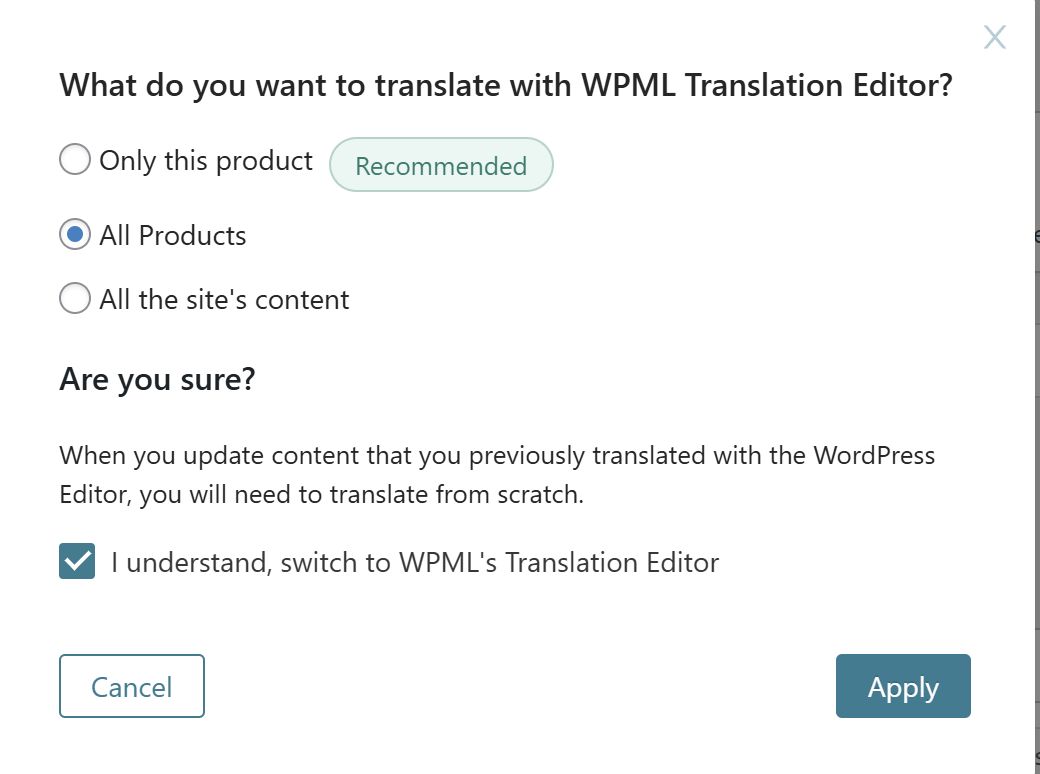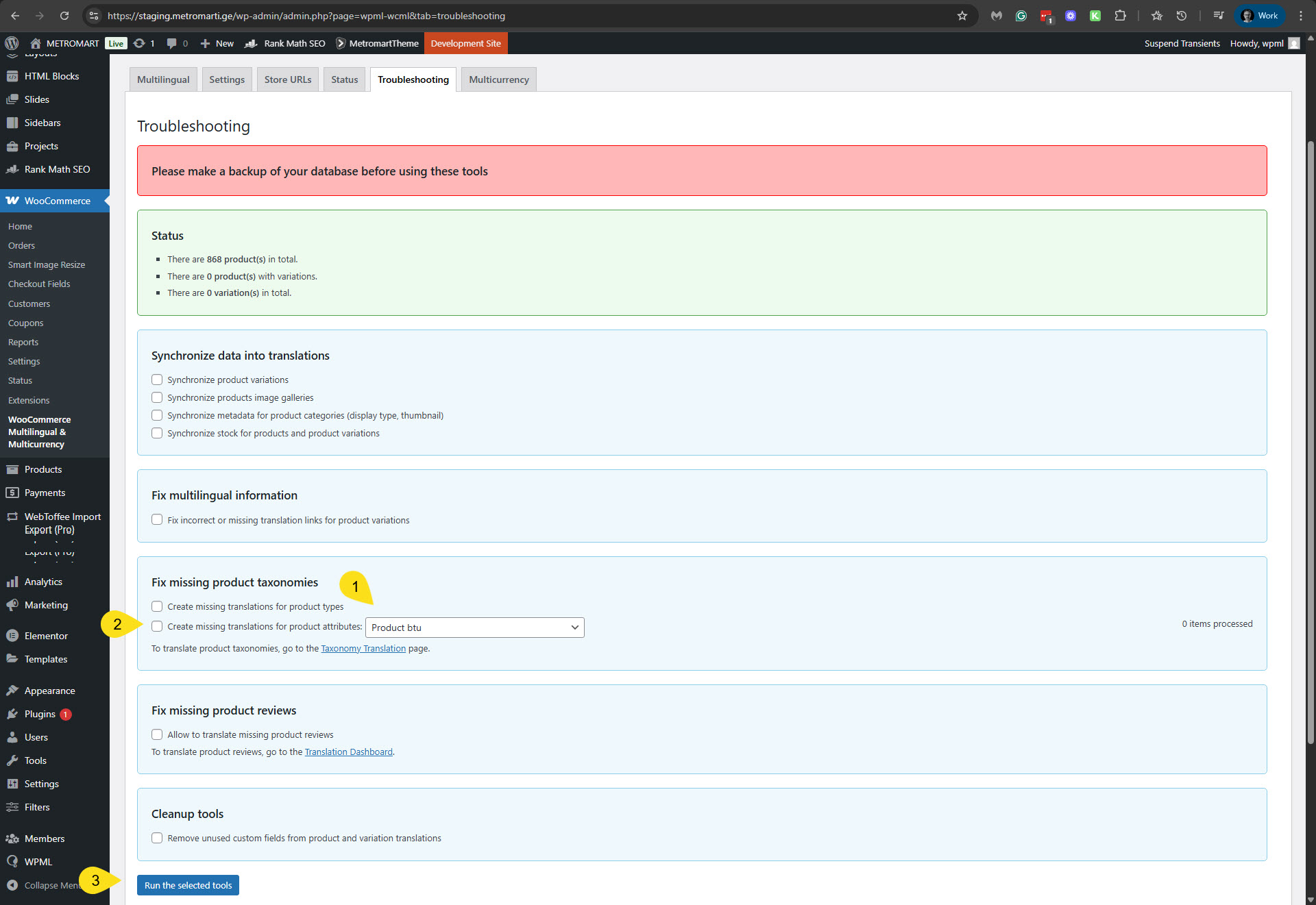 Hi, Thanks for the video. It was helpful. Once a product is translated, but the attributes are set to full back, problems like the one you experienced could occur. My suggestion to you is to translate all the attributes. You can do it in WPML -> Taxonomy Translation. If it is just a numeric value, you simply need to copy it from the original (there is a button for this). You can also add all the attributes that are not currently translated to a temporary product (explicitly created for this purpose). Then send it for automatic translation. This will translate all the attributes and will make them appear translated on all the other products they are associated with. You might need to update the products afterwards. You can also try WooCommerce Multilingual & Multicurrency and the WPML troubleshooting sections. WooCommerce Multilingual & Multicurrency 2. There, select the 'Create missing translations for product attributes' for BTU, and click the Run the selected tools button. Please see the attached screenshot, create-missing-trans.jpg. WPML 2. Go to WPML -> Support -> Troubleshooting (link) 3. Once on the troubleshooting screen, press the following buttons and check if it helps. Press each button at a time and wait for the process to complete. - 'Synchronize posts taxonomies' for 'Products' - 'Clear the cache in WPML' - 'Remove ghost entries from the translation tables' - 'Fix element_type collation' - 'Fix WPML tables collation' - 'Assign translation status to duplicated content' - 'Set language information' - 'Fix terms count' - 'Fix post type assignment for translations' *** Please make a backup of your database before using this.*** Please let me know if this information was helpful to you. Regards, |