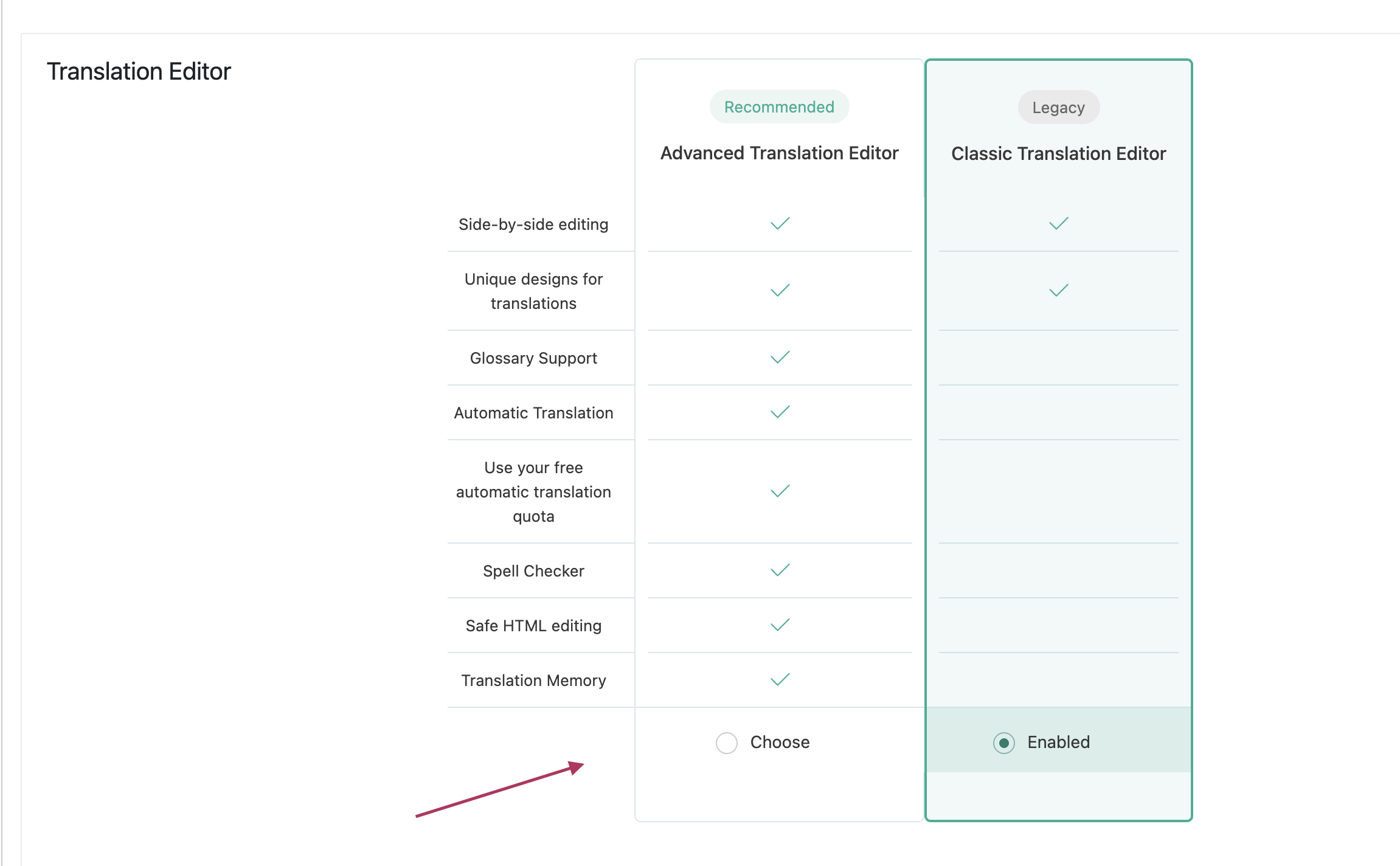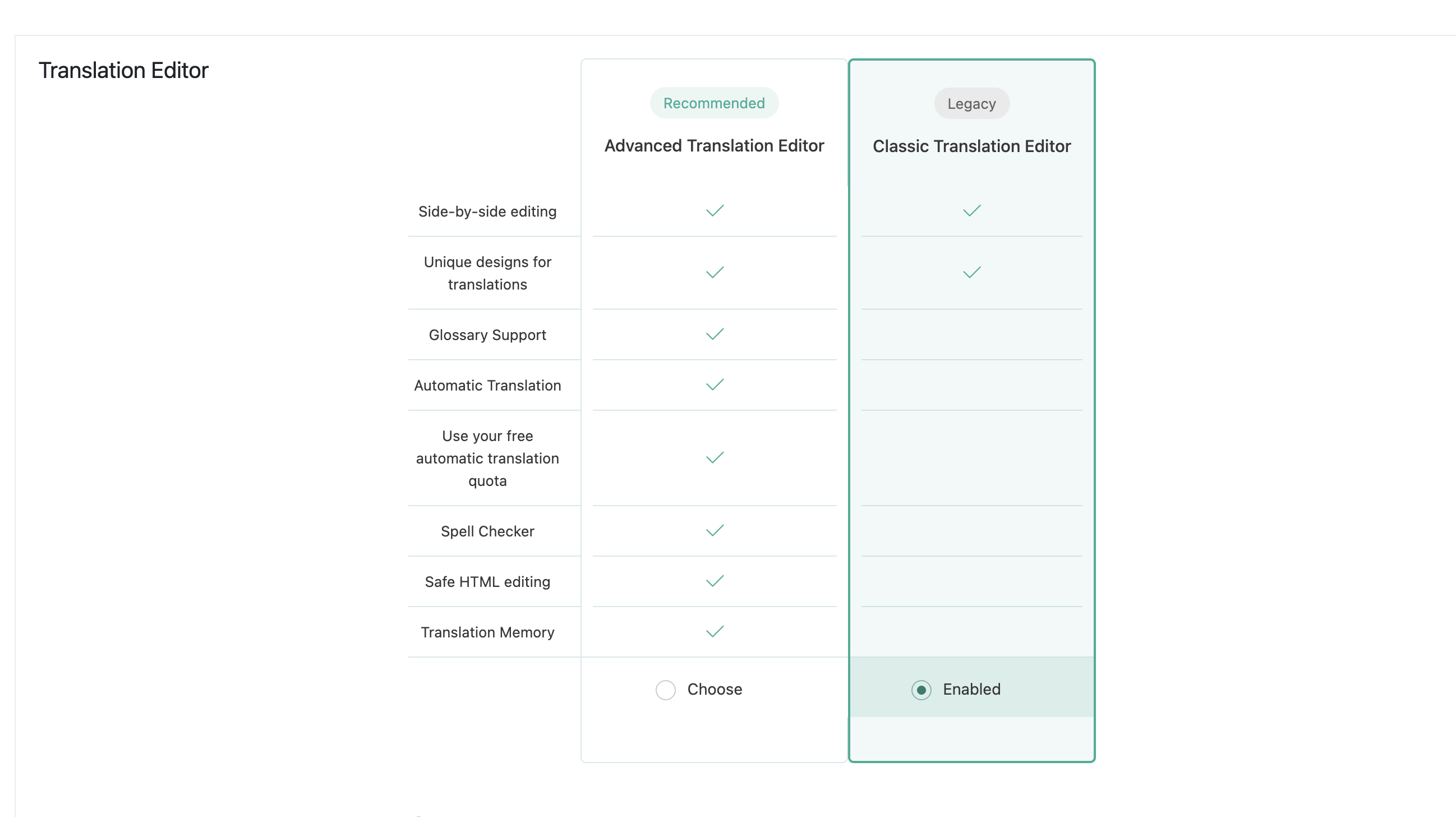 Please note that the Advanced Translation Editor includes translation memory, while the Classic Editor does not. You can find more details here:
