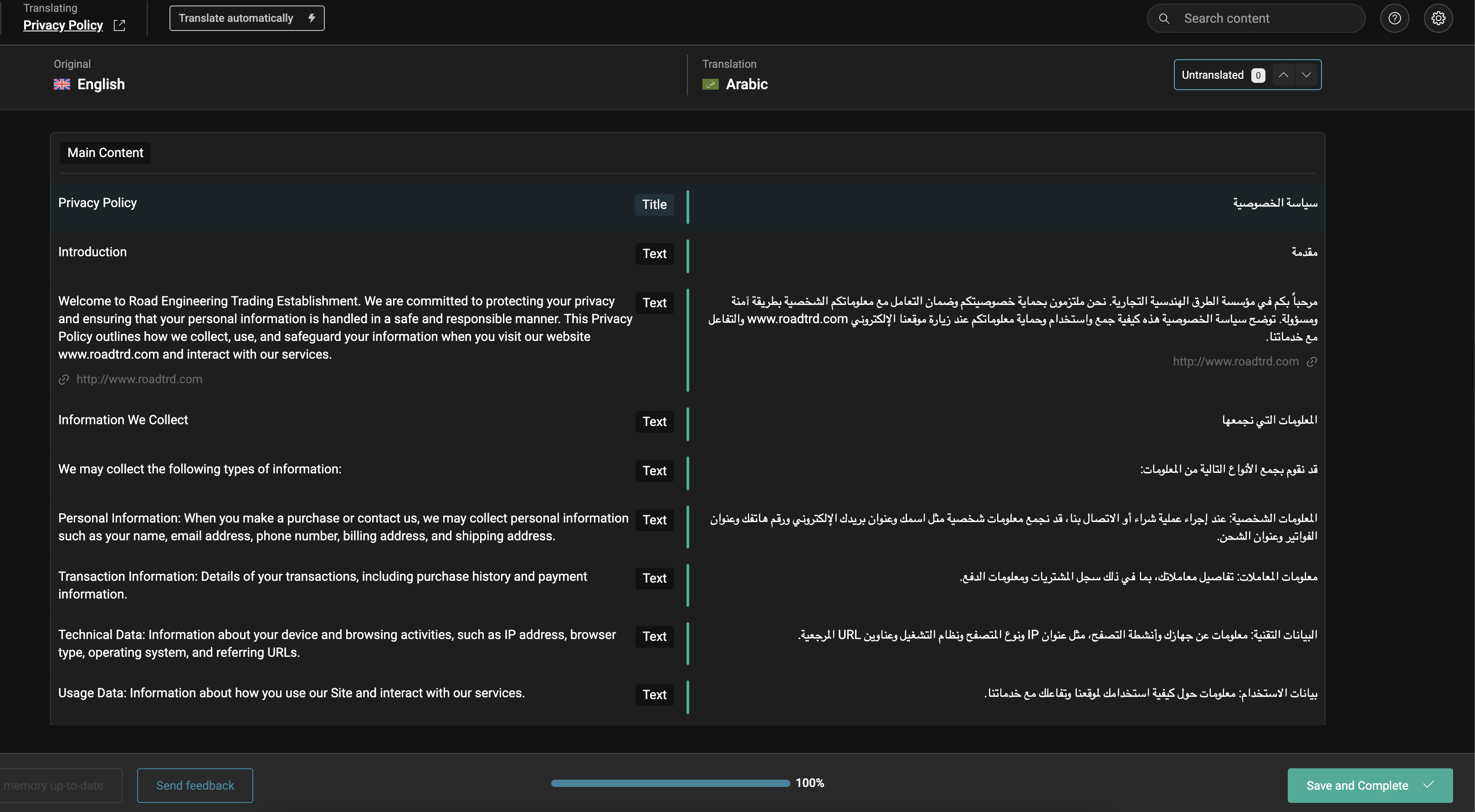 Some pages show 100% auto-translated in the backend, but when I view the Arabic version, they are still displayed in English. For example: