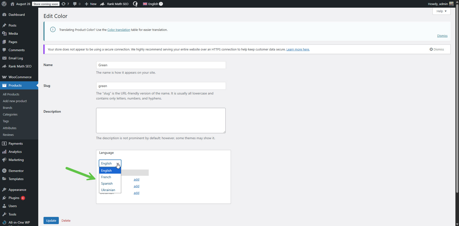 To change the language of an attribute term, you need to follow these steps.
