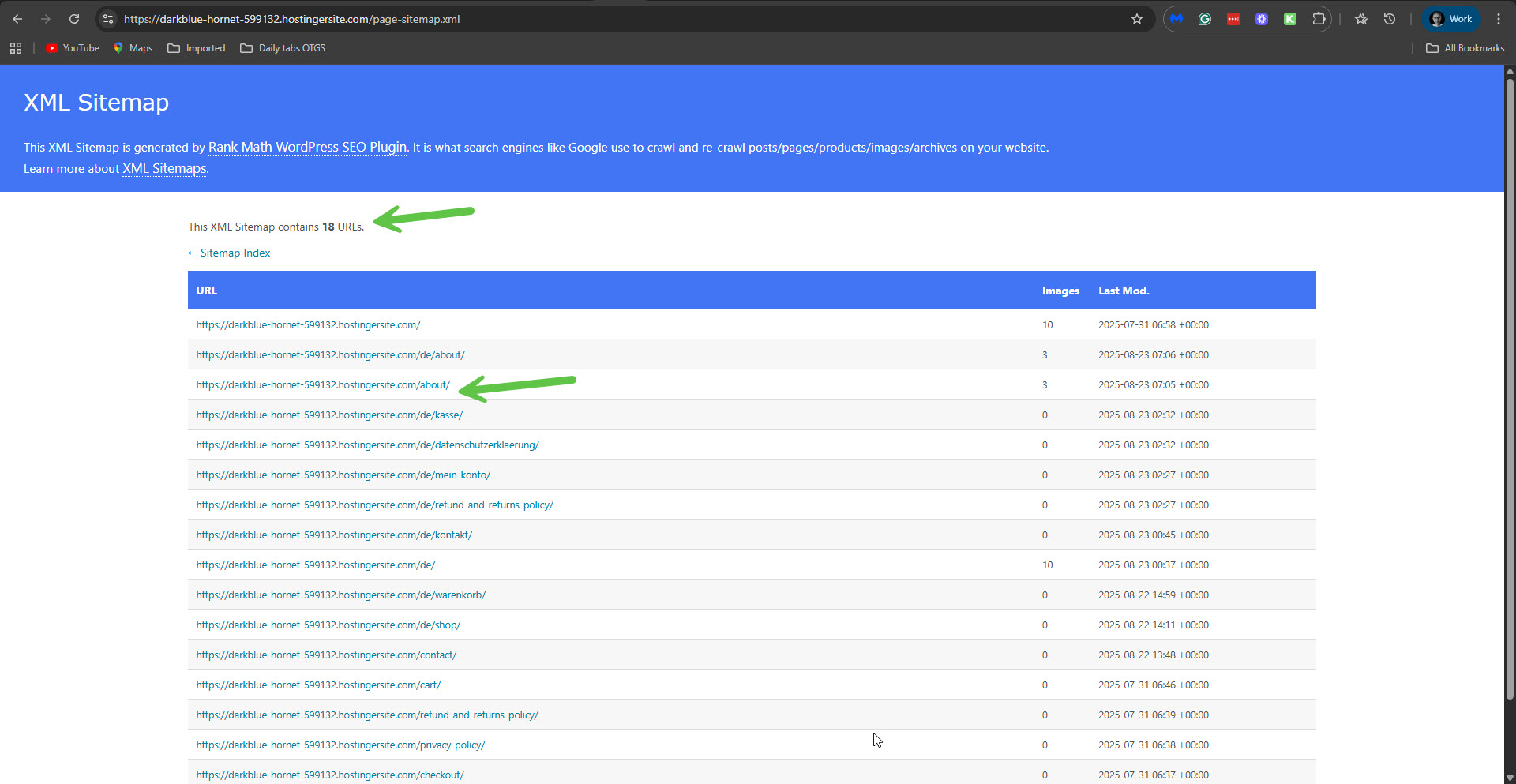 I've just checked the sitemap of your site's pages here: hidden link. It seems to be alright now. I see 18 pages, including the About page. Please see the attached screenshot 18-about.jpg. Also, when I inspect the source code of the sitemap, I can see the hreflang is alright and shows de_DE. Please see the attached screenshot de_De-ok.jpg. I assume it took time to get updated, or you need to click some settings in Rank Math to update the sitemap. Or maybe a caching issue.