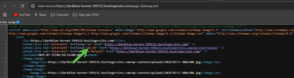 4. The hreflang in the XML sitemap seems to be incorrect. I modified the code according to the documentation and also changed hreflang to de-DE in WPML, but it still didn't work.