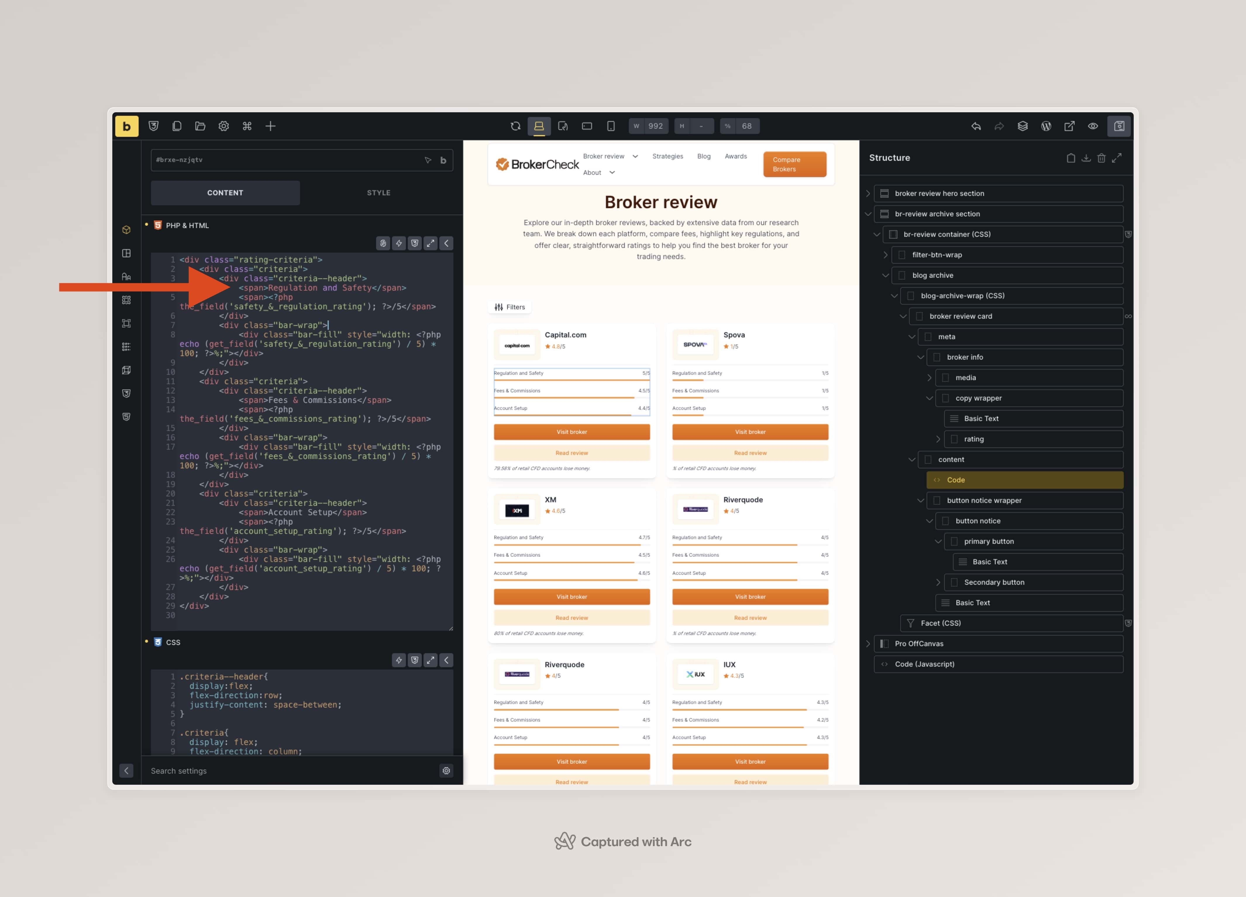 1. The template "broker review card" uses information from ACF and hard-coded strings, like "Regulation and safety";