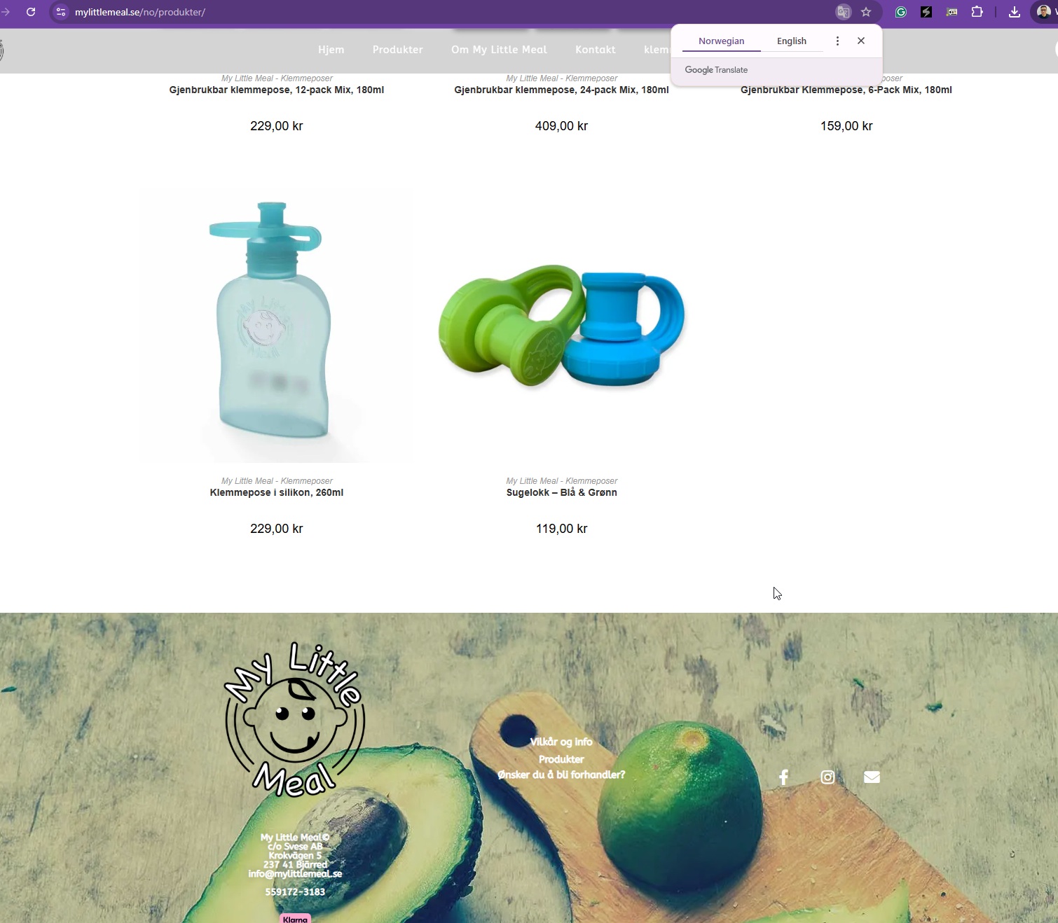 The footer shows a different design on the product page compared to the home page. When switching between languages on the product page, the design varies. The Norwegian language page displays in English.