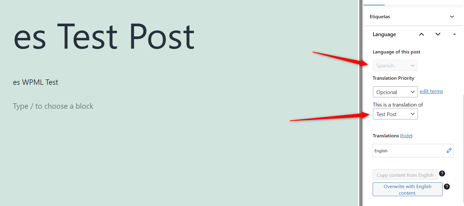 Hi Alina, Thank you for the details. I would like to continue this discussion (the French post is duplicated using the Yoast Duplicate Post plugin) in the following ticket to avoid covering multiple issues here, as this case is more closely related to that thread: Please check if you can reproduce the issue on the staging site (where a duplicate of a fully translated French post is created in English instead of French via the Yoast Duplicate Post plugin). If you can reproduce it, kindly share the URL of the original post with the issue in the related thread. This will help us track the bug more effectively. Thank you for your kind understanding. -- Bigul |