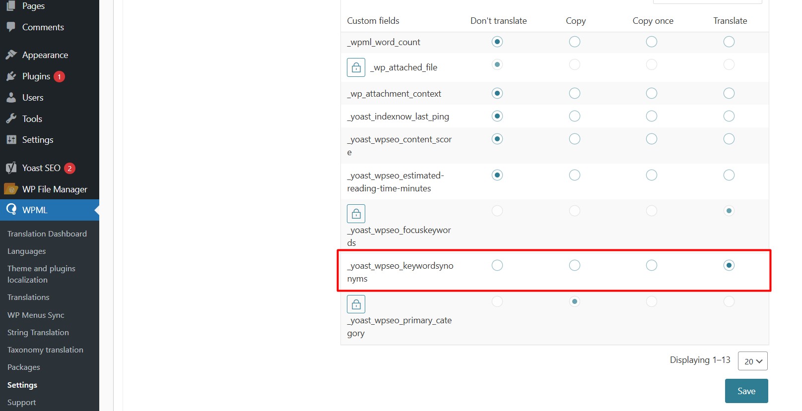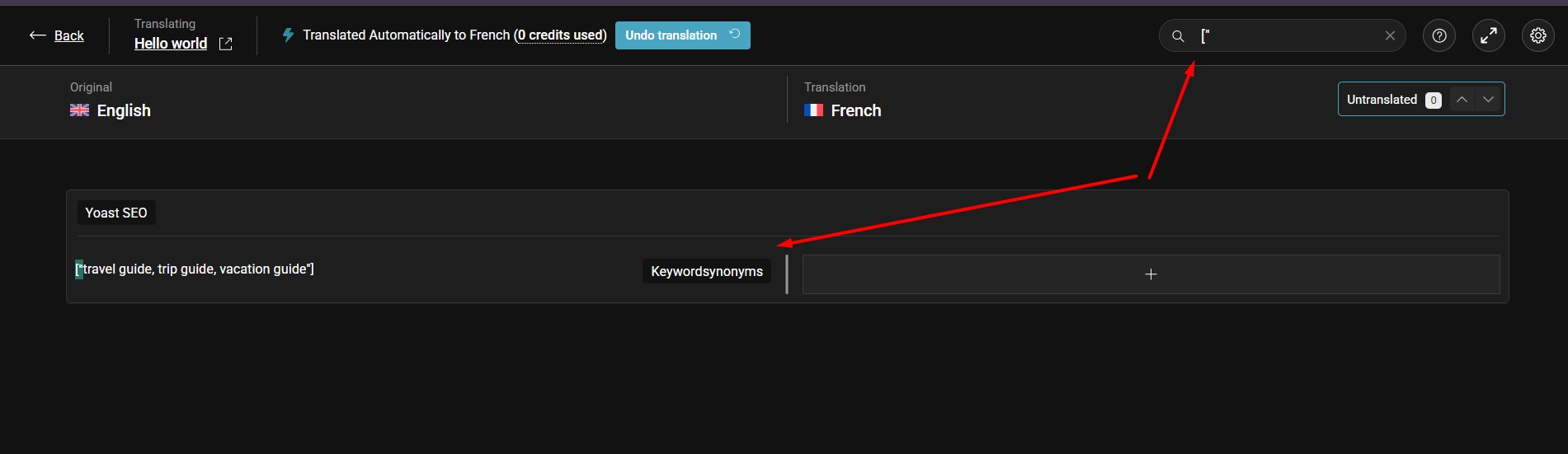 3. Set the “_yoast_wpseo_keywordsynonyms” option to “Translate”.