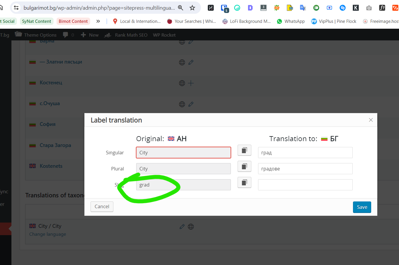 Solution: 1. We resolved the synchronization issue indicated by the warning at the top of the backend. 2. We navigated to WPML -> String Translation, searched for, and deleted the entries for 'grad'. 3. We went to WPML -> Settings -> Taxonomy translation, selected 'City', and added 'city' as a translation for the 'grad' slug, then saved the changes. 4. In the 'Real State' section under 'City', we fixed a sub-category that was missing its parent category in English. 5. We advised the client to follow these steps on the production site. 6. We also highlighted the importance of saving theme options in the correct backend language, as saving them in a secondary language might have caused the default language for strings to change.