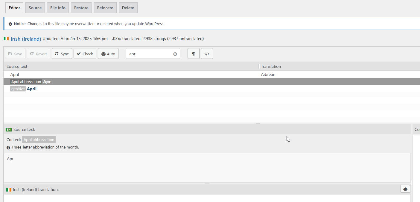 The issue was identified with the "ga_IE" locale, which is not supported on translate.wordpress.org, and should be set to "ga" (Irish Gaelic) instead. There is no .mo file available in wp-content/languages/ for the current locale, and the translation progress for this locale is below the required threshold, preventing automatic downloads. We recommended using the LocoTranslate plugin to translate the default strings. The client should specify the language as a custom option within LocoTranslate and proceed with translating the months accordingly. This solution was confirmed to work as the client successfully translated the default months using LocoTranslate.
