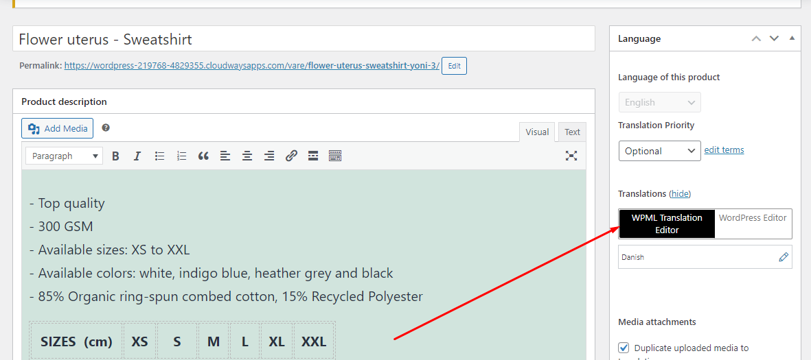 Problem: The client is unable to see the translated names of WooCommerce product attributes like 'color' and 'size' on the Danish version of their site, despite setting translations in WooCommerce Multilingual & Multicurrency. Solution: 1. Ensure that the WooCommerce plugin is updated to the latest version. 2. Recognize that local attributes added from the product edit screen are only translatable using the WPML Translation Editor. 3. Enable the WPML Translation Editor for the product, and use the Advanced Translation Editor to complete the translations. 4. After applying these steps, check the frontend to see if the translations appear correctly.