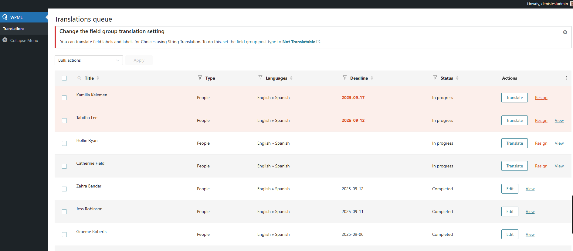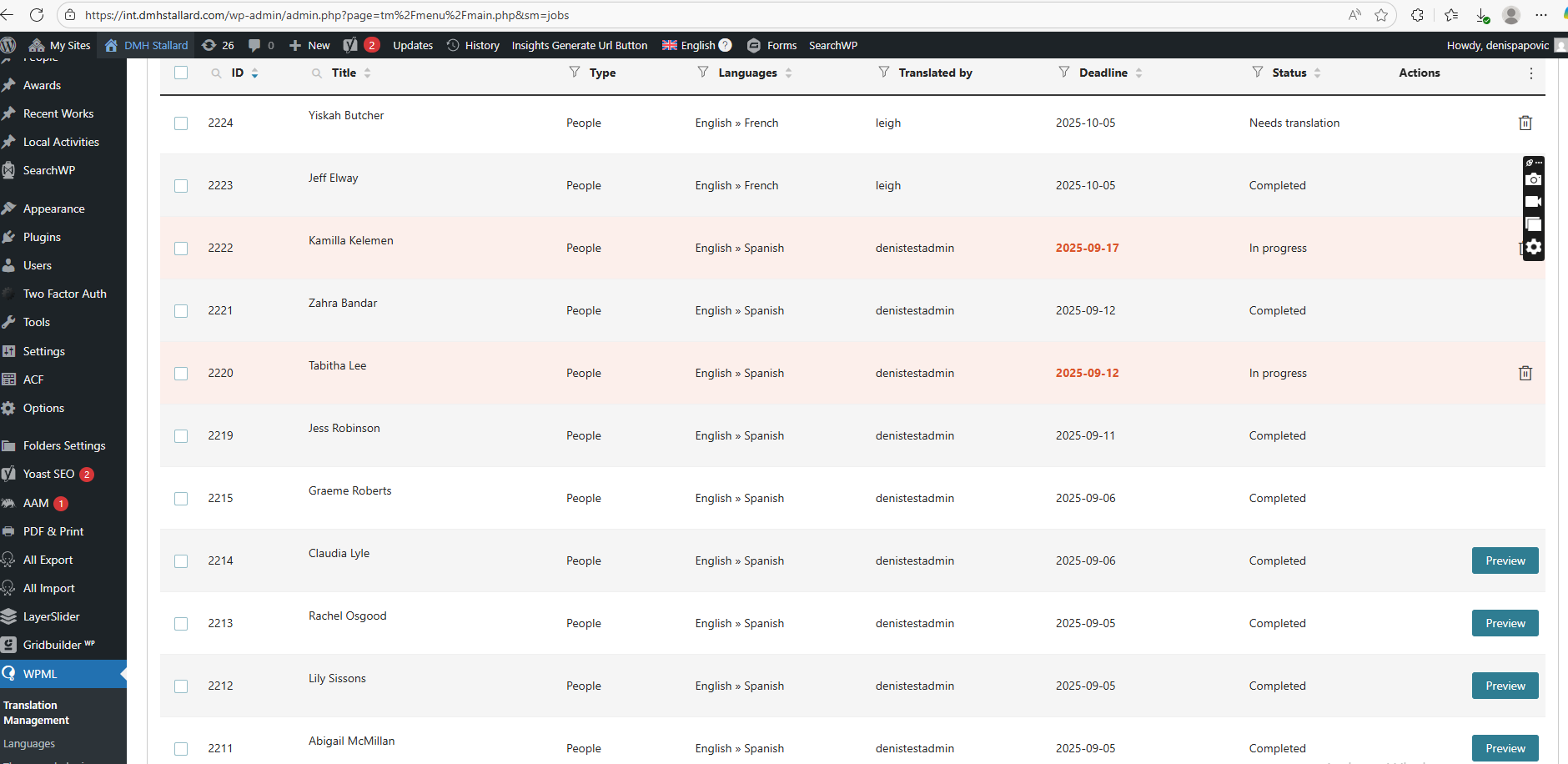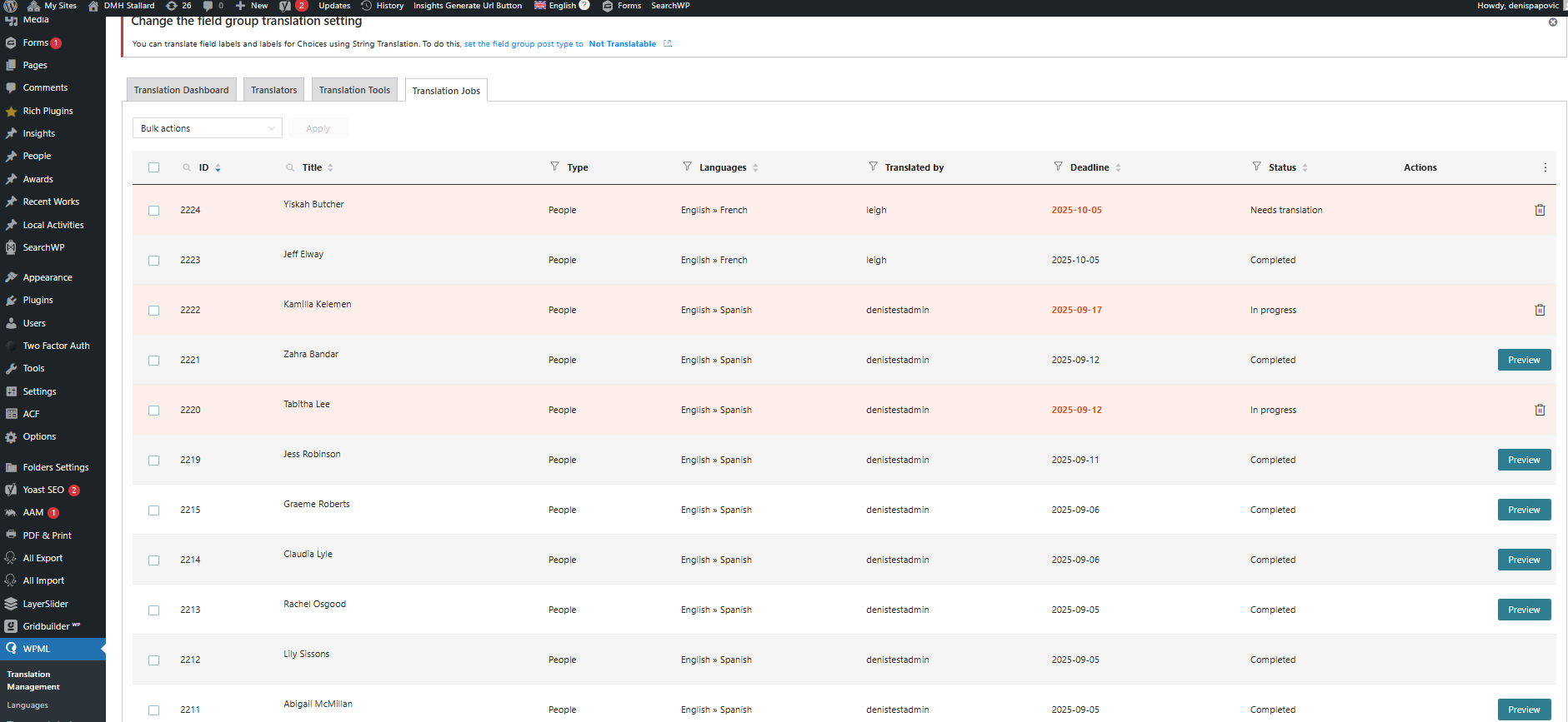 We have a custom post type “People“ on our website. We have a translation manager, that we want to be able to assign the work to a translator, then when translator finishes the job, we want our translation manager to review translated post, and if everything is fine, to publish it. We manage to get it to work somehow, but the accessibility of the translation jobs from a view of translation manager is not so great, so we were wandering if there is something we can do about it, that’s integrated inside WPML settings. OK let’s start from the beginning. We want the scenario when translator finishes job, the newly translated post is not published, until translator manager reviews it. The only way we manage to achieve this is by selecting “Save the translated post as a draft“ on “When you receive completed translations“ section. But this also means that when translator manager translates the page, or edit translated page, it also goes to draft. It would be really useful if we would have an option when translator finishes the job, status of that post inside Translation Management → Translation Jobs tab, goes to something like “Needs review“, and then when translator manager reviews it changes the state to publish. I saw that there is something similar in documentation, but we couldn’t find anywhere the way for our translated post to reach that status. After the job is done by the translator side, the status always goes to “Completed“. Can we also somehow make translated posts go to drafts only when assigned to a translator? It’s hard to review translated posts from the Translation Jobs tab At the moment for all our translated jobs, when you hover over it there is only one option - to view the original post. There is no other action that could be taken from there. This means that our translator manager needs to go to the original post, then add language extension to the page, then review the post, then edit the post, and finally publish it from the edit page backend. This is very impractical. We tried to make this cycle a bit shorter by adding a preview button into Translation jobs button Action column, which adds a language extension to the post, and opens translated version of a post. php // Enqueue JS on Translation Management pages only for allowed users $current_user = wp_get_current_user(); wp_enqueue_script( // AJAX handler to return current user roles JS jQuery(document).ready(function ($) { const langMap = { const allowedRoles = ['administrator', 'translation_manager', 'super_admin']; // Check if user is allowed function setupButtons() { const originalLink = row.find('td.wpml-title-column a[href]').attr('href') || ''; // Get status safely // Build Preview URL // Add Preview button actionsCell.prepend($('<div class="ant-space-item">').append(button)); // Initial run // MutationObserver for dynamic updates But we are sure that there must be a way to make this better from the WPML setup console. Could you help us to get there? Translator manager couldn’t tell from the Transaltion jobs tab which posts are reviewed and published and which one are drafted and needs to be reviewed. All posts have the same status “Completed“ and translation manager could not tell which ones are finished and which ones are awaiting for a review. Is there something we can do to make this more accessible? And how we can make translated posts out of the queue? We don't want a translator access to the translation version of the post, and to be able to edit it, once the job is finished. Also how can we remove it from the translation jobs tab as well for translator manager. If you need anything let me know. Thank you, Denis |