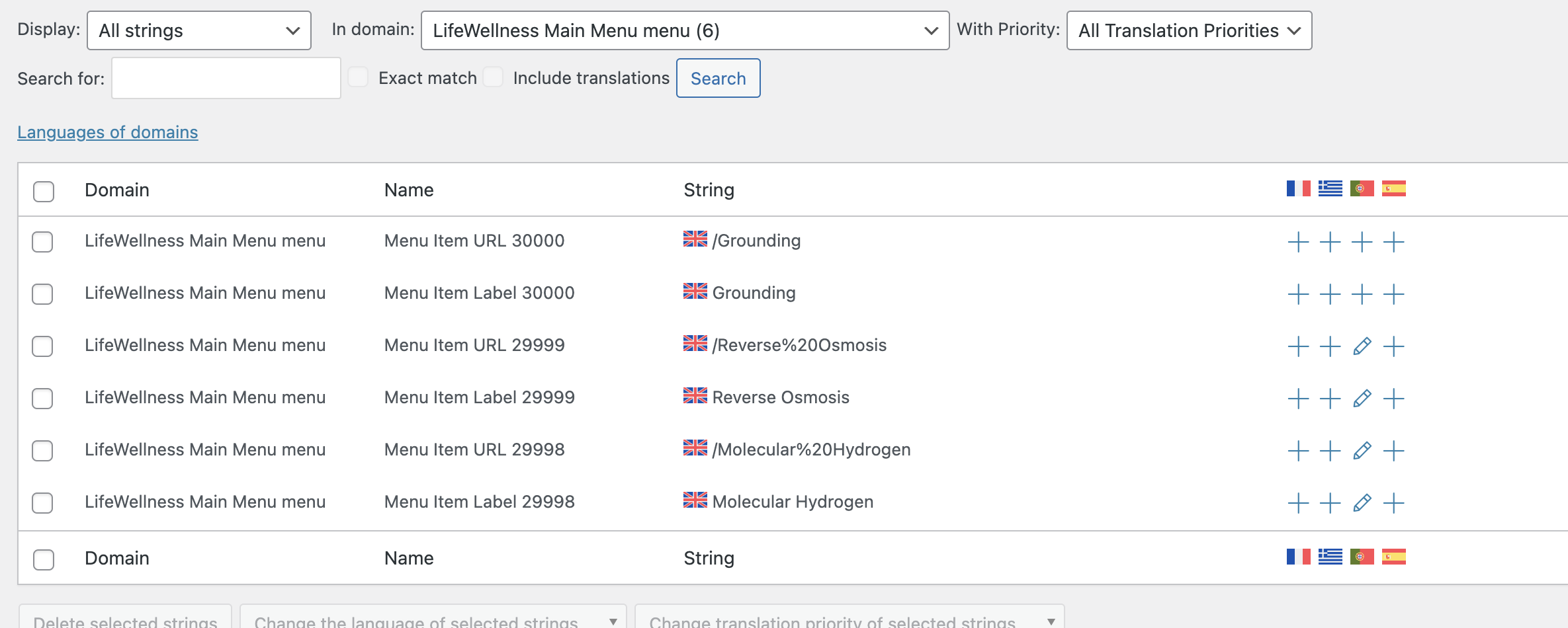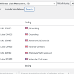 Only the first menus are translated, but the submenus do not change. When I try to filter the strings for translation, not all the strings I previously chose appear, and some that do appear are not translated.