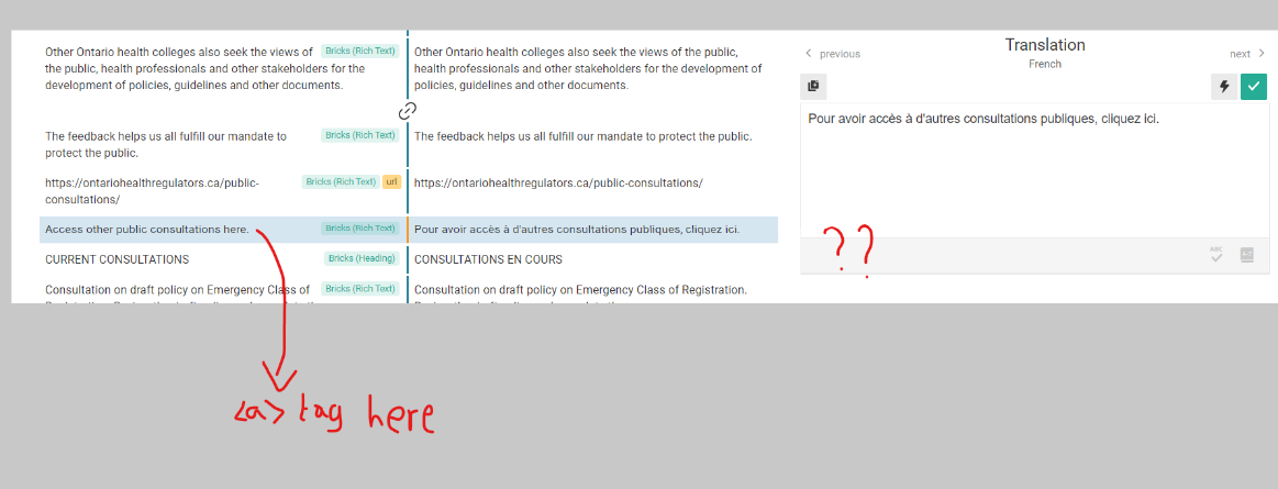 The translator doesn’t recognize the hyperlink correctly. When I translate the text I am forced to do it without selecting the anchor and highlighting the text because it is not detected, when I do that it turns green. However, it reverts back to orange or yellow when I move to the next text. This prevents me from fully translating the page.