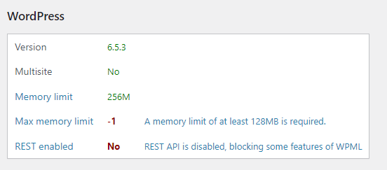 One thing to note, I am unable to turn the REST enabled to YES, it shows as No on the WPML support page. I am not sure if that has a major effect on this, however I followed the instructions on how to test it, and it seemed to be enabled. You can check this link with my dev site URL: hidden link