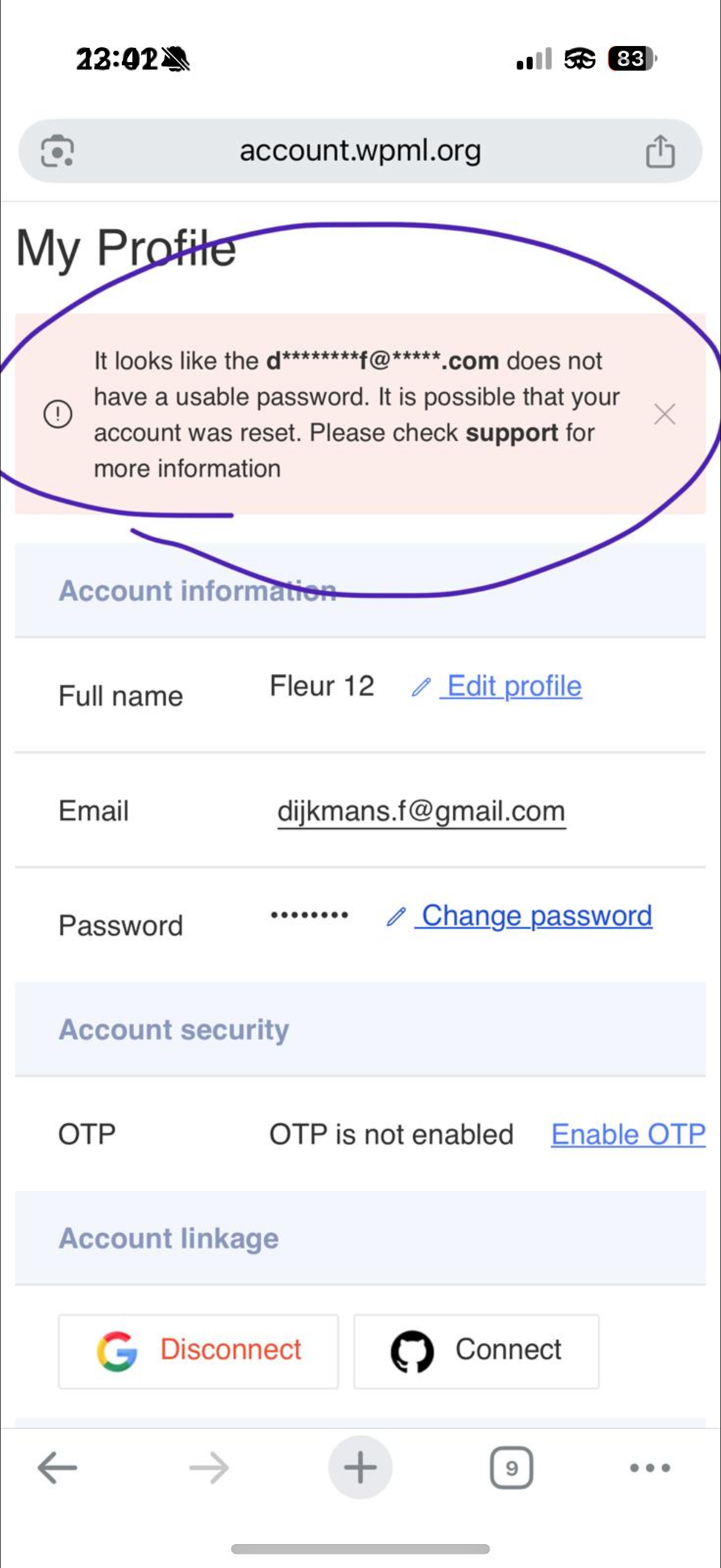 The client is unable to log in to their WPML account using an email and password because their account is linked to their Google account.
