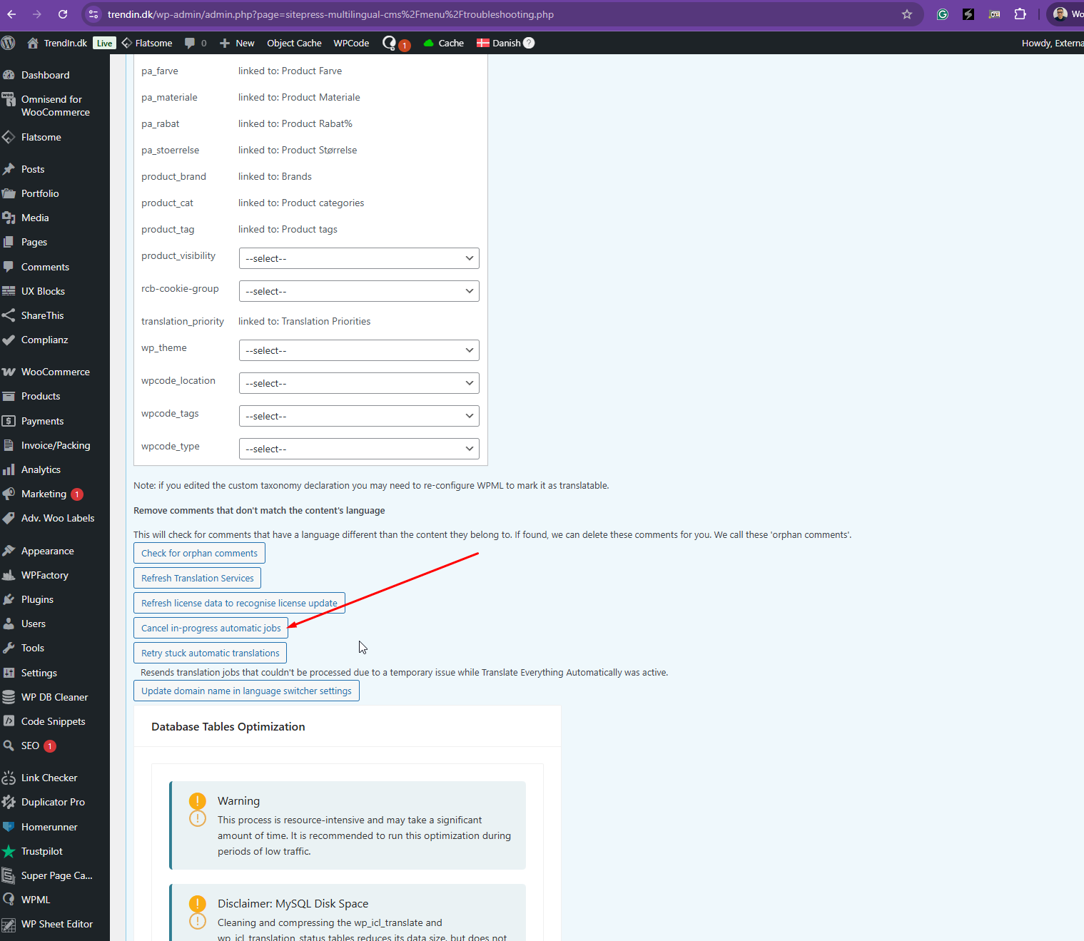 Thanks for your reply. The email is referring to your server's insufficient memory. Kindly share this error log with your hosting provider, and they will know what to do from their end. An error of type E_ERROR occurred on line 150 in the file `/var/www/trendin.dk/public_html/wp-content/plugins/sitepress-multilingual-cms/classes/translations/TranslationElements/FieldCompression.php`. Error message: `Allowed memory size of 536870912 bytes exhausted (tried to allocate 32768 bytes)` |