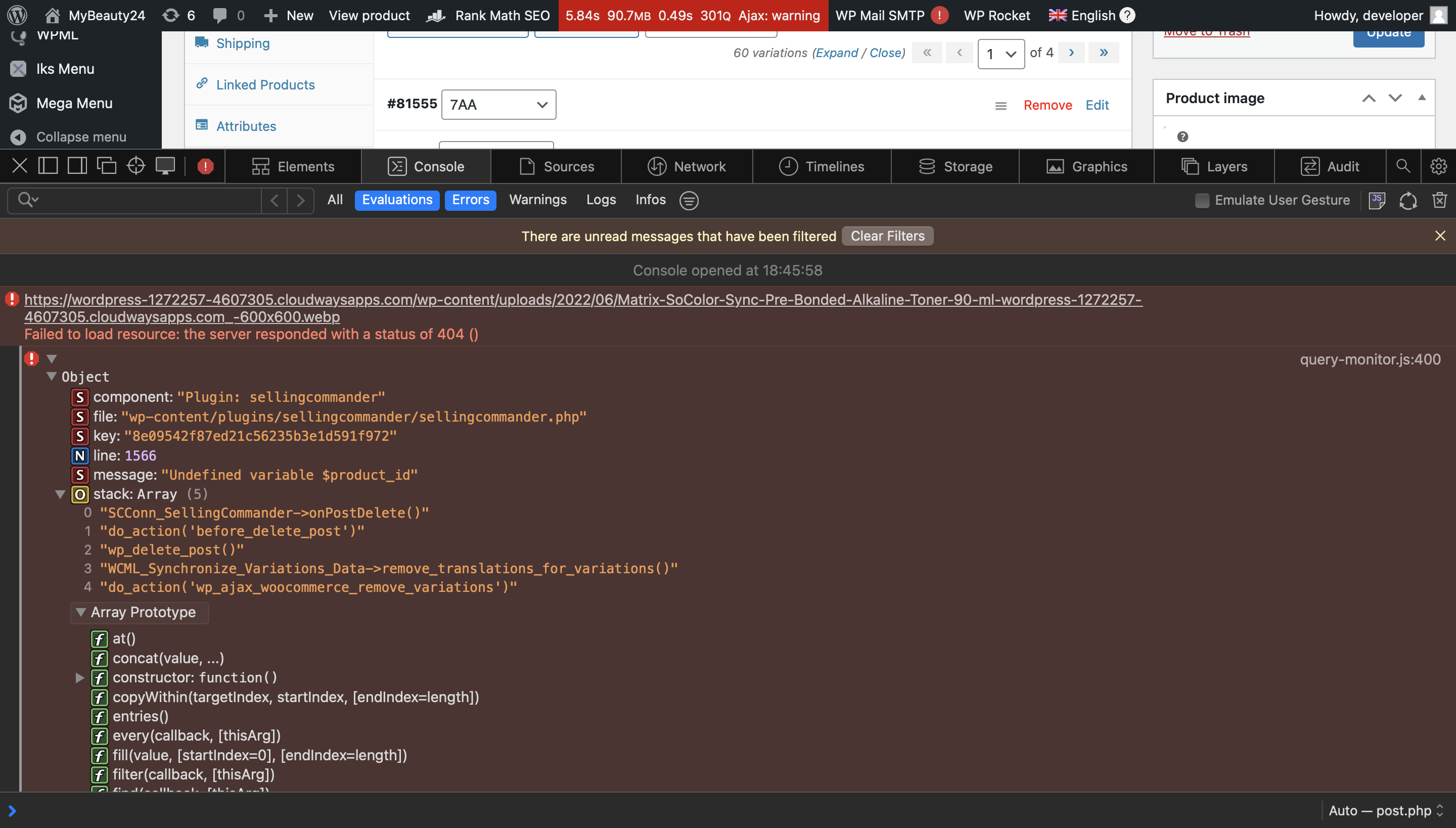 And received the error as seen as on the added screenshot. Could it be related to the issue we are having? Because even after updating the product using WPML advanced translation editor, variations that I deleted from English are not syncing.