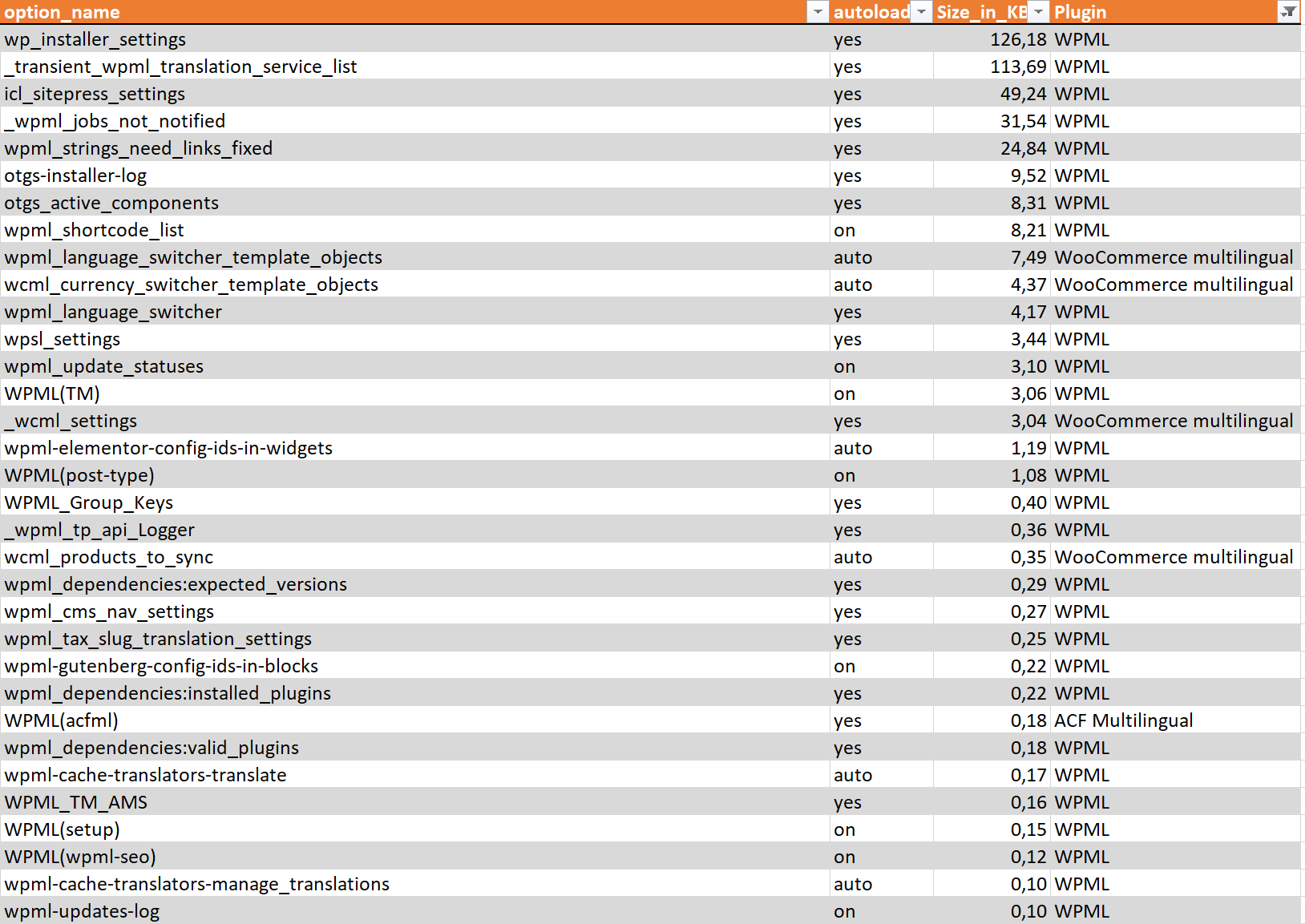In my case, there are 85 WPML-related autoloaded entries. At first glance, some of them seem difficult to justify as autoloaded, for example: