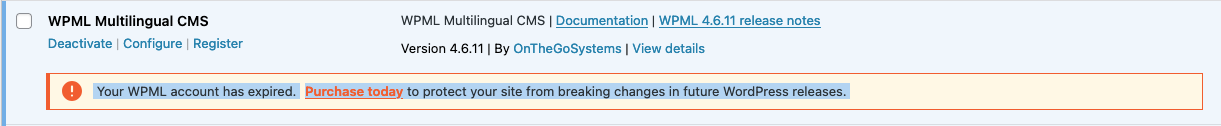 You are trying to update to the current version of WPML and have installed it correctly. However, you see a message on the plugin page in WordPress stating 'Your WPML account has expired. Purchase today to protect your site from breaking changes in future WordPress releases.'